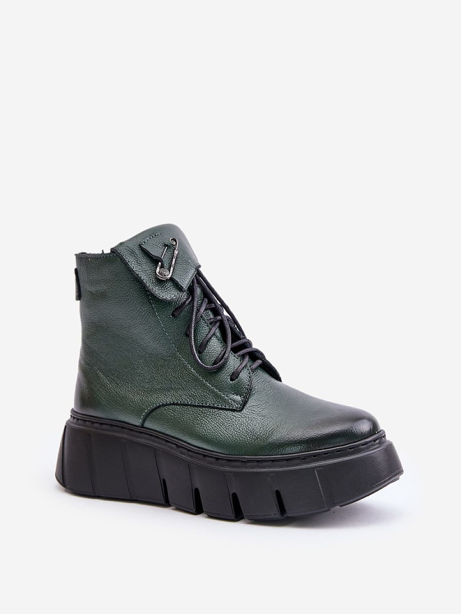 Women’s natural leather platform boots are the perfect combination of style and functionality. They feature both lacing and a zipper for a comfortable fit on the foot. The rounded toe adds subtlety, while the safety pin embellishment introduces a unique touch. The shoe blanket-insulated interior guarantees warmth and comfort, making them an excellent choice for colder days.