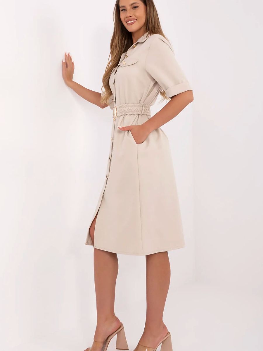 Elegant and stylish shirt dress is a perfect choice for work, everyday wear, and formal occasions. Made of high quality polyester and elastane blend, it guarantees comfort and lightness of the material. The classic collar and button closure give it an elegant and timeless character. The short sleeve ensures comfort, and the midi length makes the dress look elegant and professional. An additional advantage is the belted waist, which emphasizes the waist, shaping the silhouette. Inset pockets add practicality and a more casual touch. This versatile proposal is for women who appreciate a combination of elegance and functionality in their everyday style.