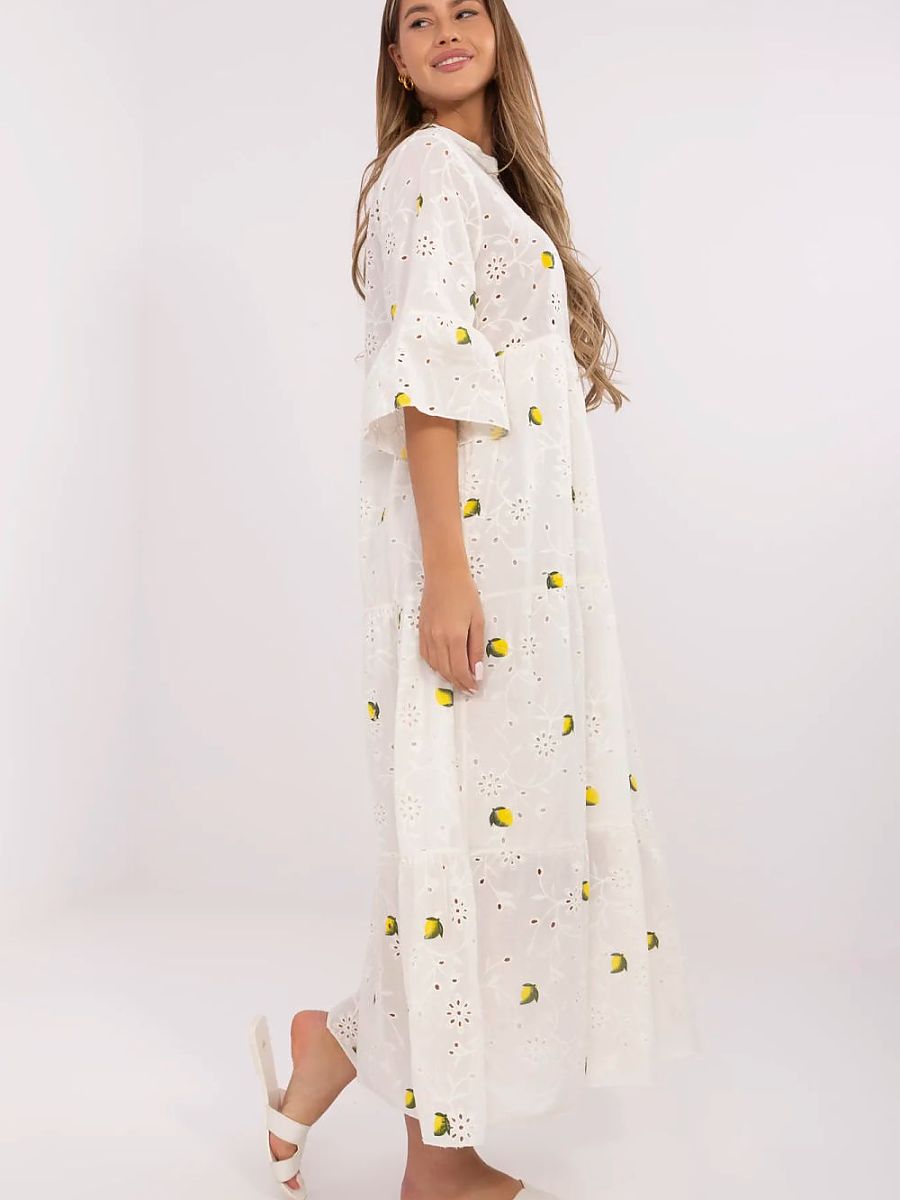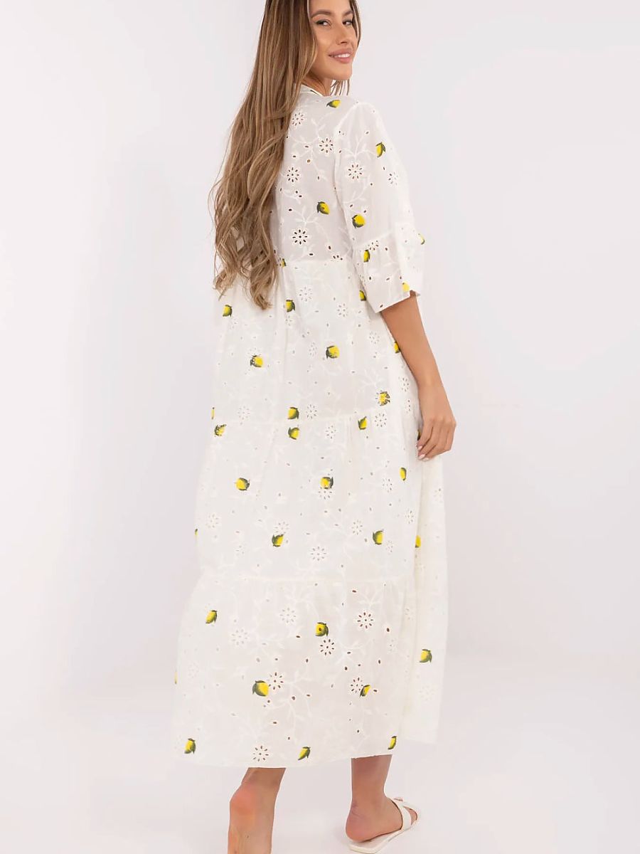 Airy, cotton boho style dress is the perfect choice for summer. The oversized cut provides freedom and comfort, while the maxi length adds lightness and romance. The charming lemon print combined with lace embroidery creates a unique, holiday look. The dress has 3/4 sleeves finished with a ruffle, an elegant stand-up collar, and a button fastening. Additionally, equipped with a lining, which ensures full comfort when wearing. Ideal for everyday walks, summer meetings, and moments of relaxation.