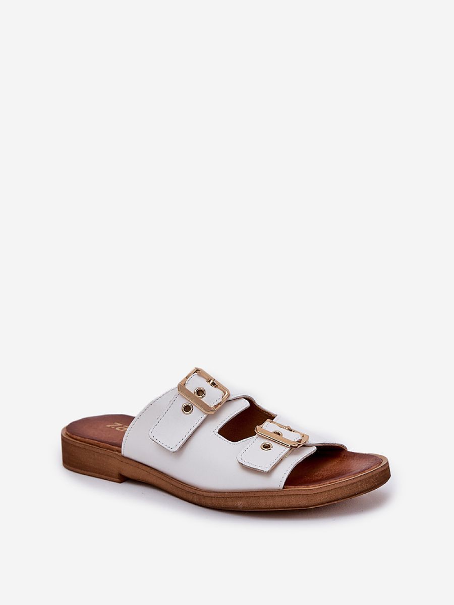 Leather women's sandals with a flat heel are an elegant proposition that combines comfort with modern style. They feature two gold buckles with adjustable straps that not only ensure a perfect fit to the foot but also serve as a fashionable accent, adding a subtle shine. Thanks to the flat heel, these sandals are comfortable and stable, making them ideal for everyday wear, suitable for both casual and more elegant outfits. The leather upper guarantees durability and comfort, making these sandals an excellent choice for hot days.