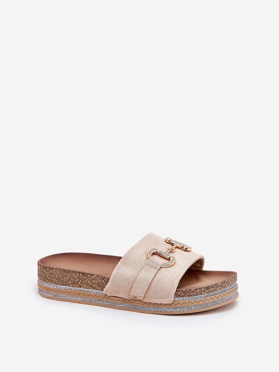 Slippers made of eco suede. At the front, there is a decorative gold detail that gives them a subtle glow. Set on a platform adorned with sequins, they add a touch of glamour to any outfit. The profiled insole ensures comfort all day long. Perfect for summer days, these slippers go well with dresses, skirts or pants, combining a fashionable look with functionality.