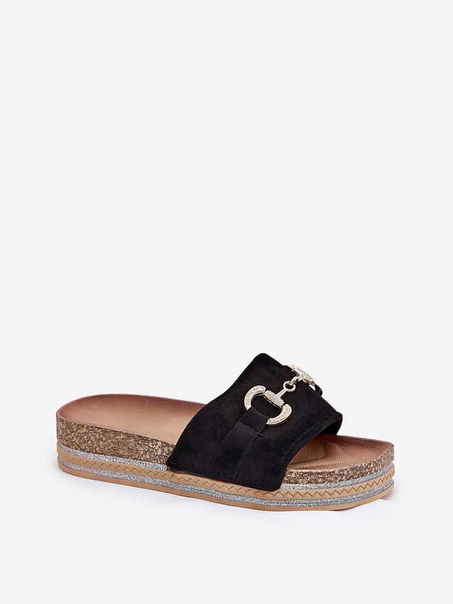 Slippers made of eco suede. At the front, there is a decorative gold detail that gives them a subtle shine. Set on a platform decorated with sequins, they bring a touch of glamour to any outfit. The profiled insole ensures comfort throughout the day. Perfect for summer days, these slippers go perfectly with dresses, skirts or pants, combining a fashionable look with functionality.