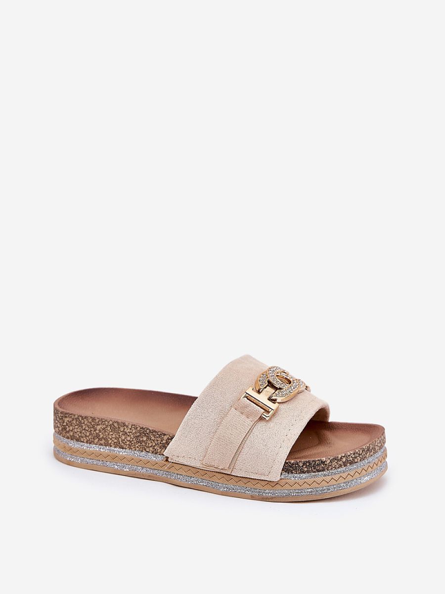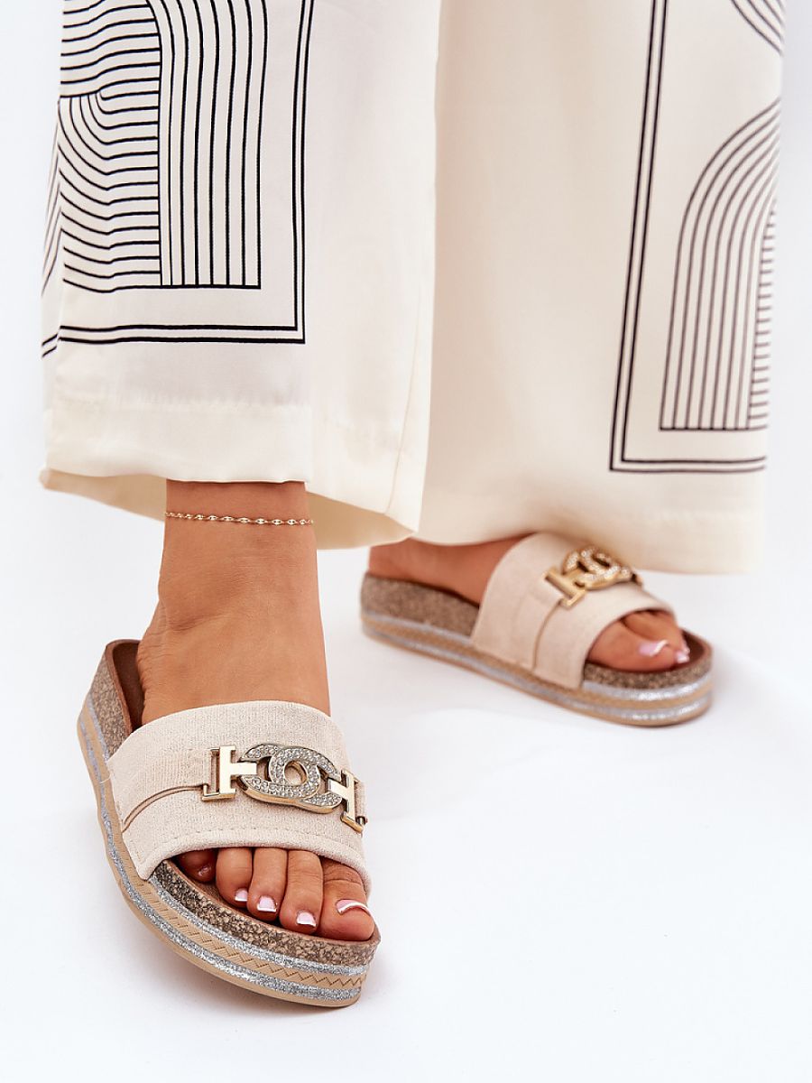 Sandals made of eco-suede. At the front, there is a decorative golden detail that adds a unique character to them. Set on a platform with sequins, which brings a bit of shine and elegance to every outfit. These sandals will be a perfect choice for summer days, perfectly matching with dresses, skirts, or shorts, adding a modern accent to every look.