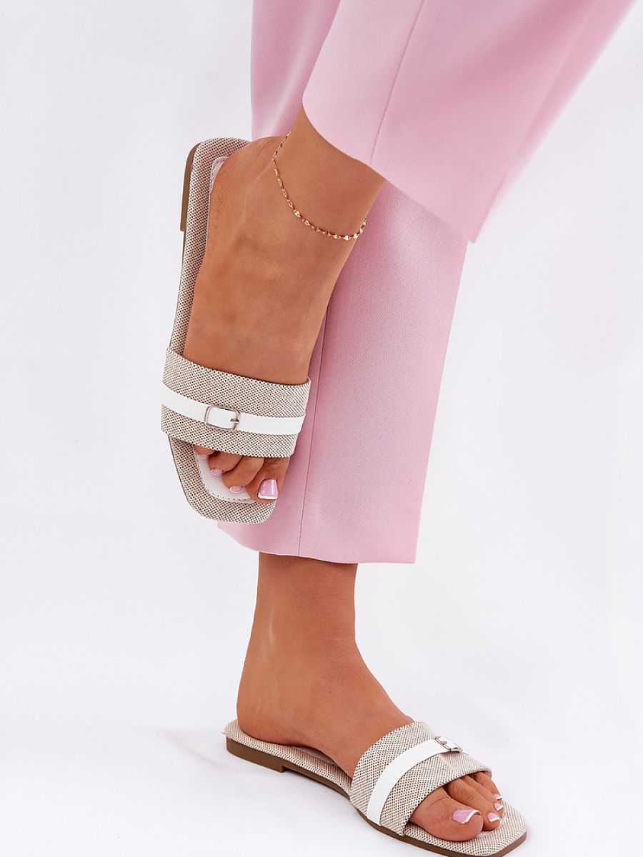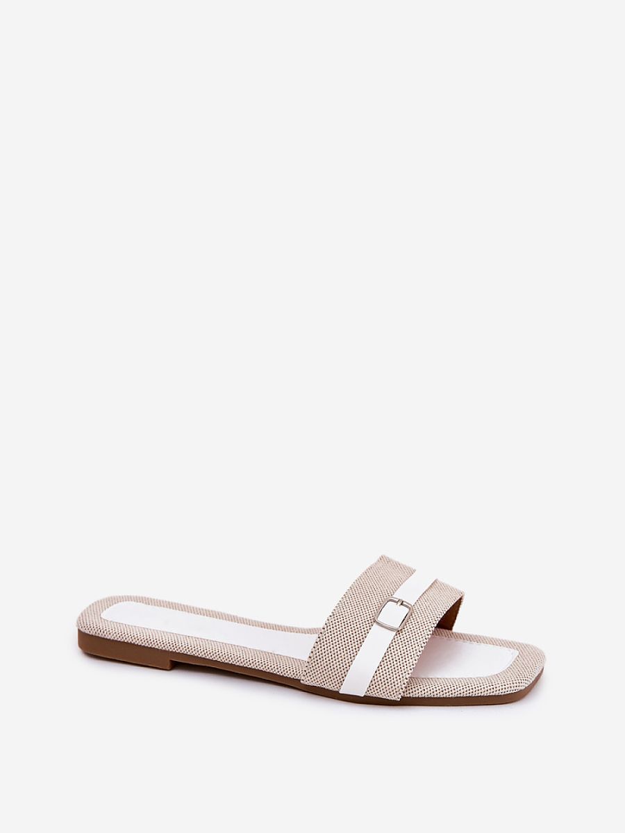 Flat women’s flip-flops made of textile material that combine comfort with subtle style. Adorned with a thin strap with a buckle at the front. Perfect for warm days, these flip-flops go perfectly with light summer dresses and fabric trousers.