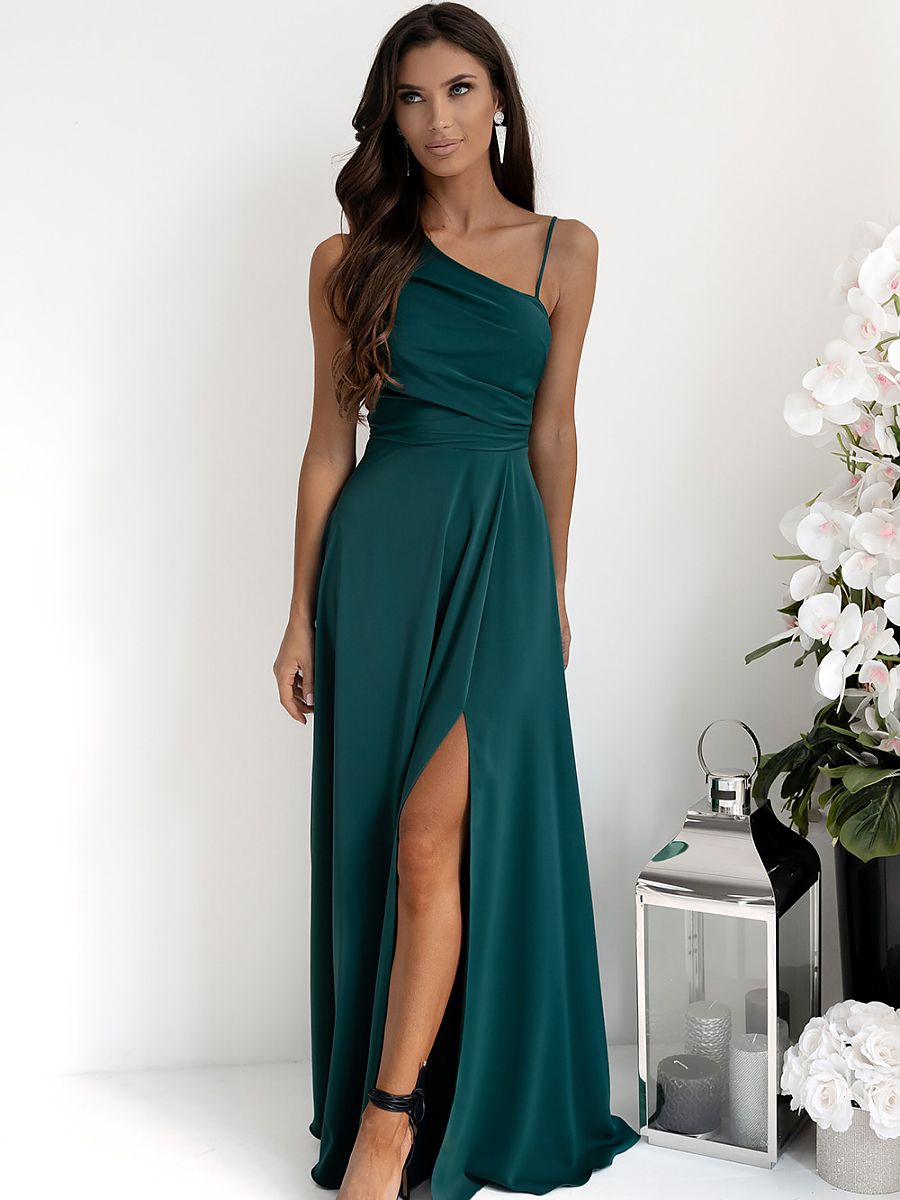 Long straight dress with asymmetric straps, one thin, the other thicker. The dress is cut at the waist, flared bottom. The dress fastens with a covered zipper on the side. Decorative cutout with braided tie on the back.
