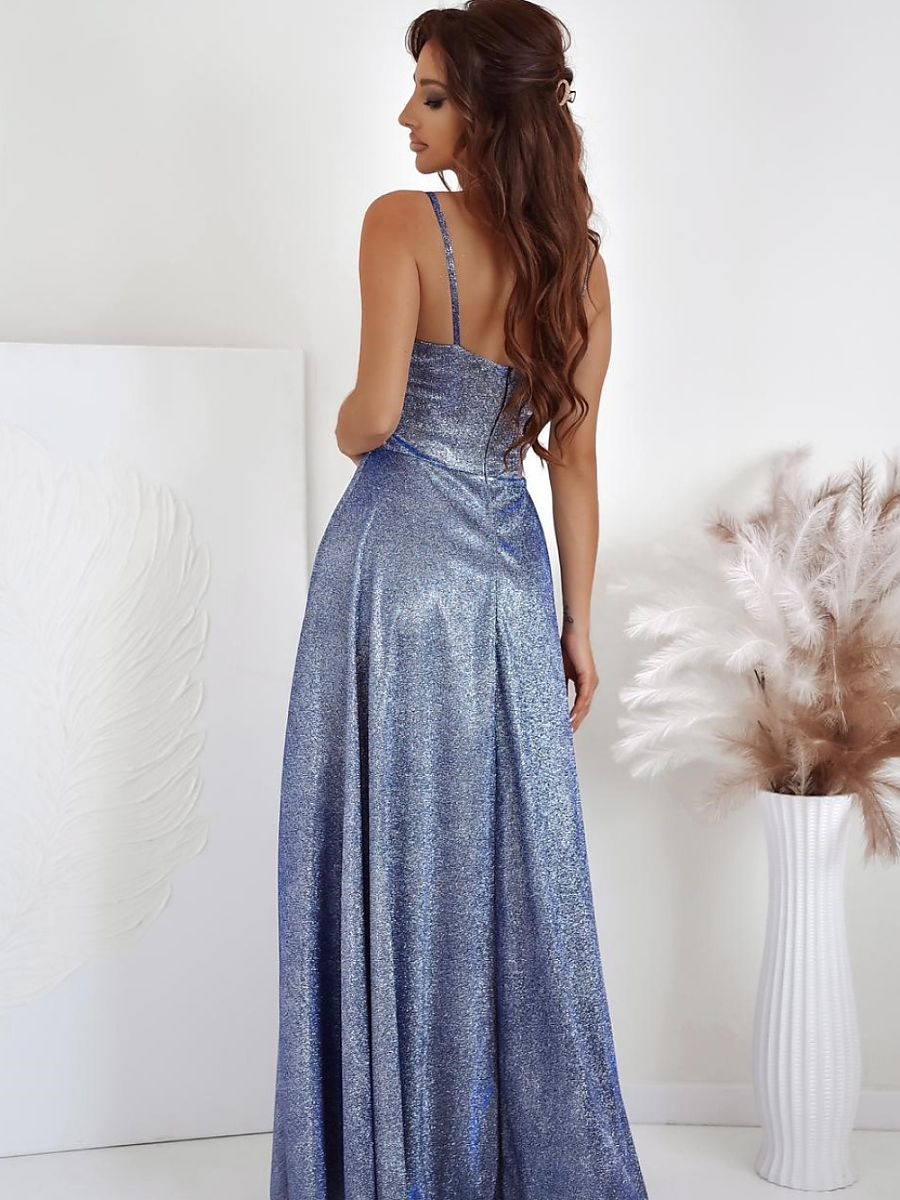Long, elegant dress with a striking slit that accentuates the silhouette and adds sensuality. A model with thin straps, fastened at the back with a discreet, covered zipper, ensuring a perfect fit. The corset top with a deep neckline highlights the cleavage and accentuates the waist, creating a feminine, harmonious line. Made of shiny material that beautifully reflects light, giving the outfit a luxurious character. This is a perfect choice for special occasions, evening outings, and elegant receptions.