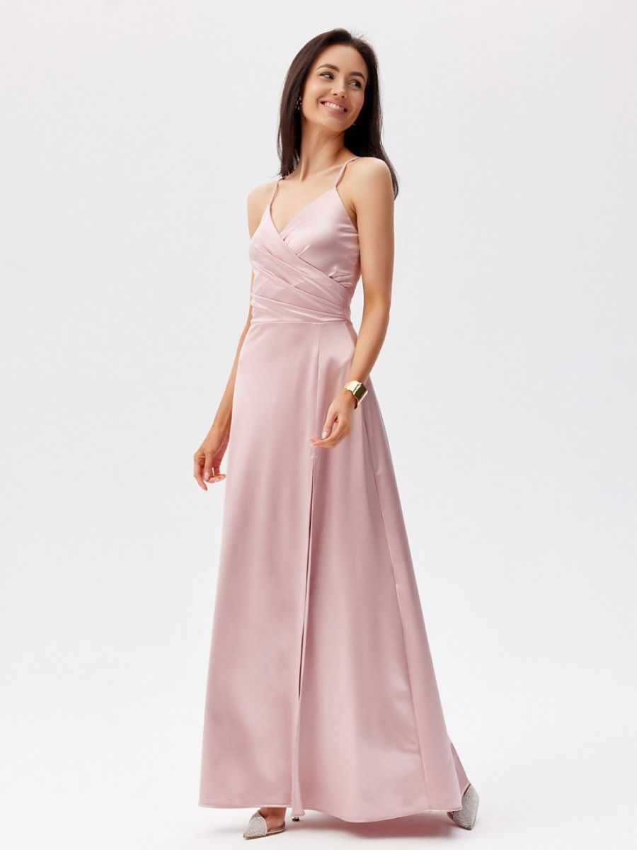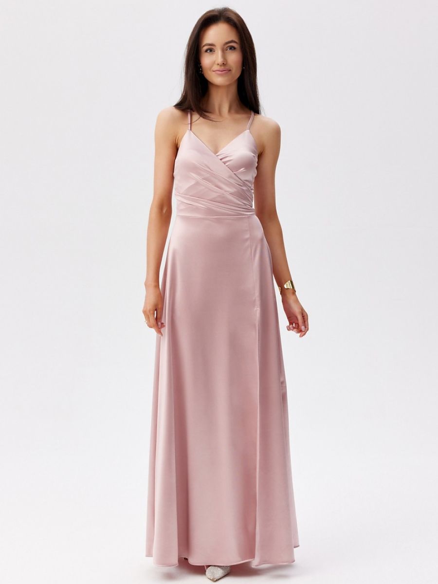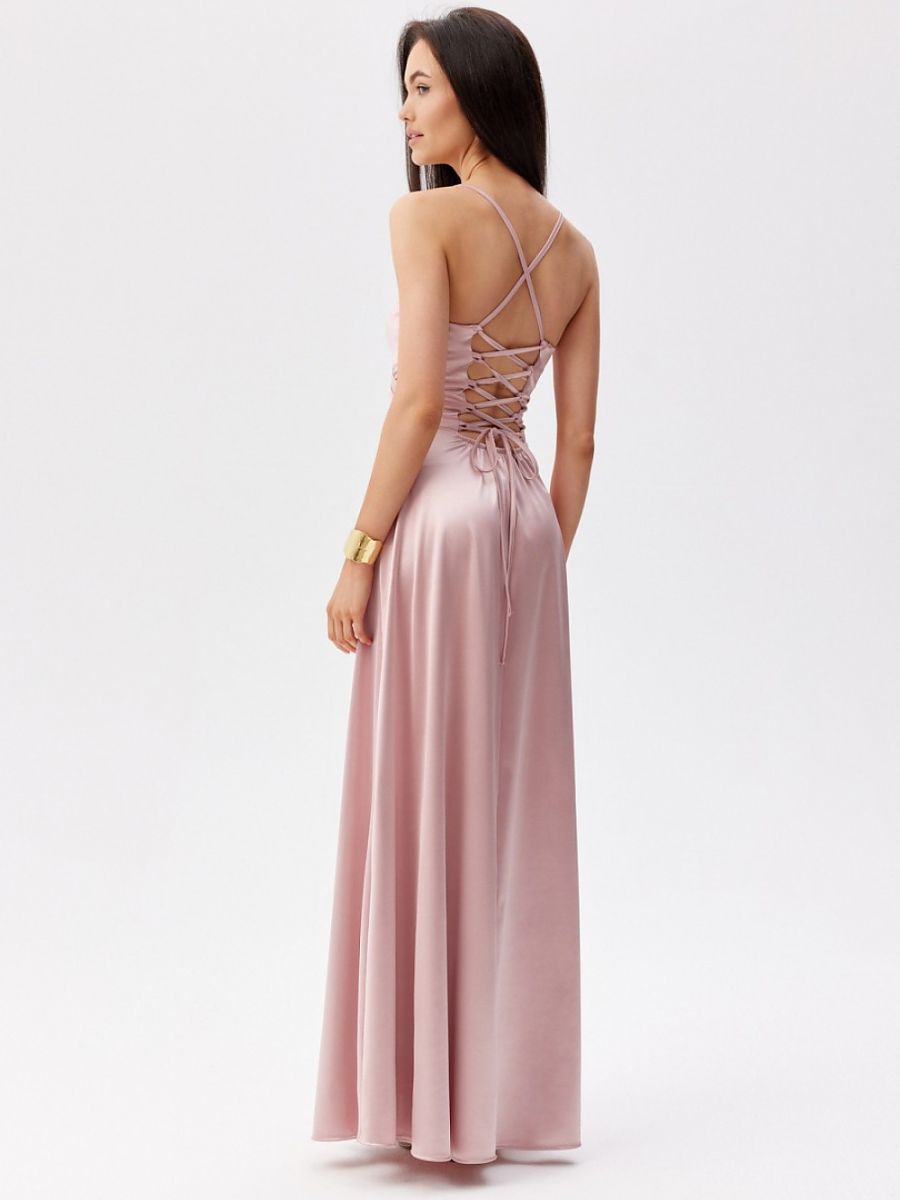 Maxi dress with thin straps. The top is wrap-around, and the bottom is slightly flared with a slit for the leg. It does not have a lining, has decorative lacing on the back, which allows for a perfect fit to the silhouette.