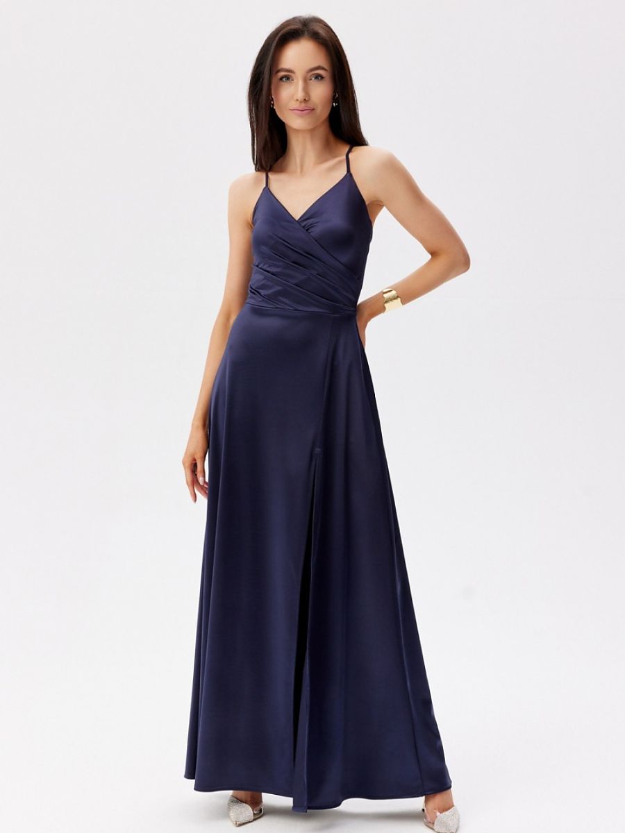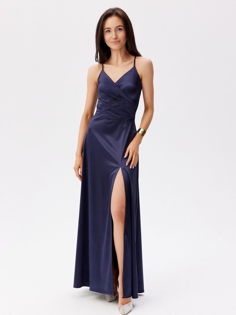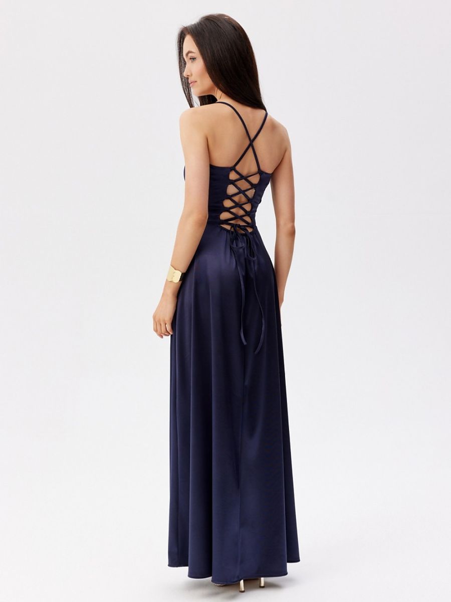 Maxi dress with thin straps. Wrap top, and the bottom slightly flared with a slit at the leg. It does not have a lining, it has decorative lacing on the back, which allows for a perfect fit to the silhouette.