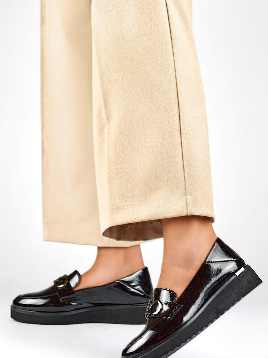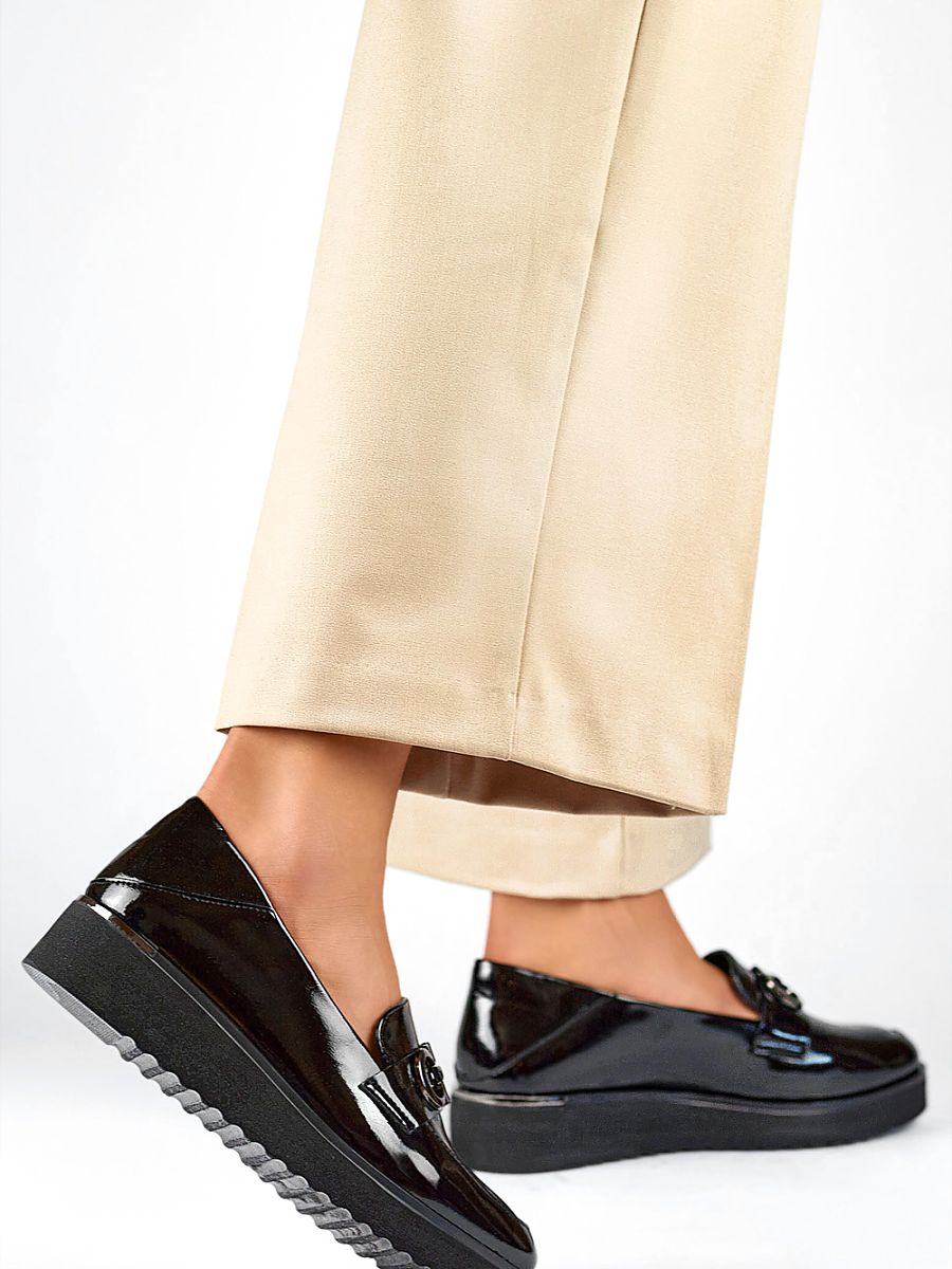 Black women’s shoes made of patent leather are an elegant choice for any season. Their slip-on cut ensures comfortable putting on, and the insole made of natural leather guarantees comfort of wearing and breathability of the feet throughout the day. The half-shoes are equipped with a 4 cm high heel, which adds subtle height, while providing stability and comfort. The round toe accentuates the classic and timeless design of the shoes, which are perfect for both everyday and more formal outfits.