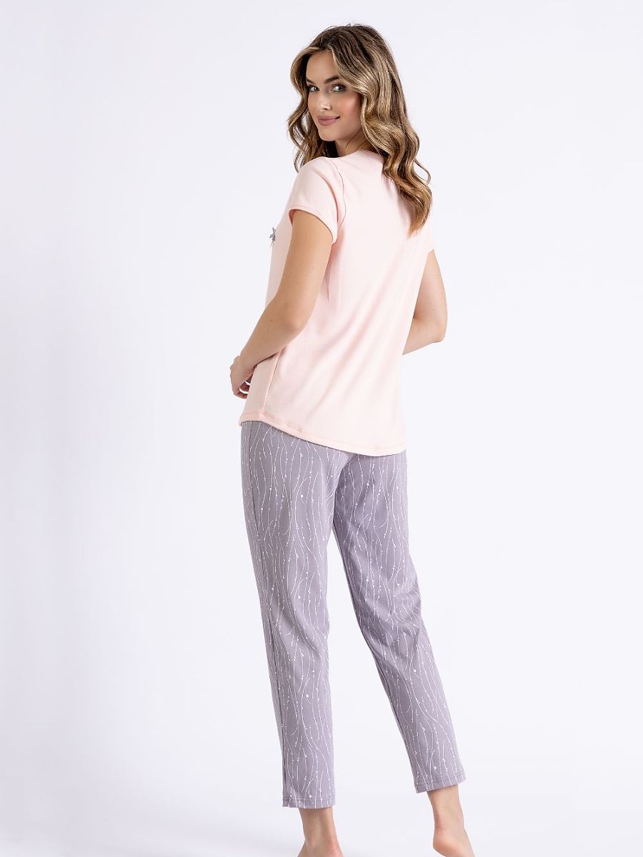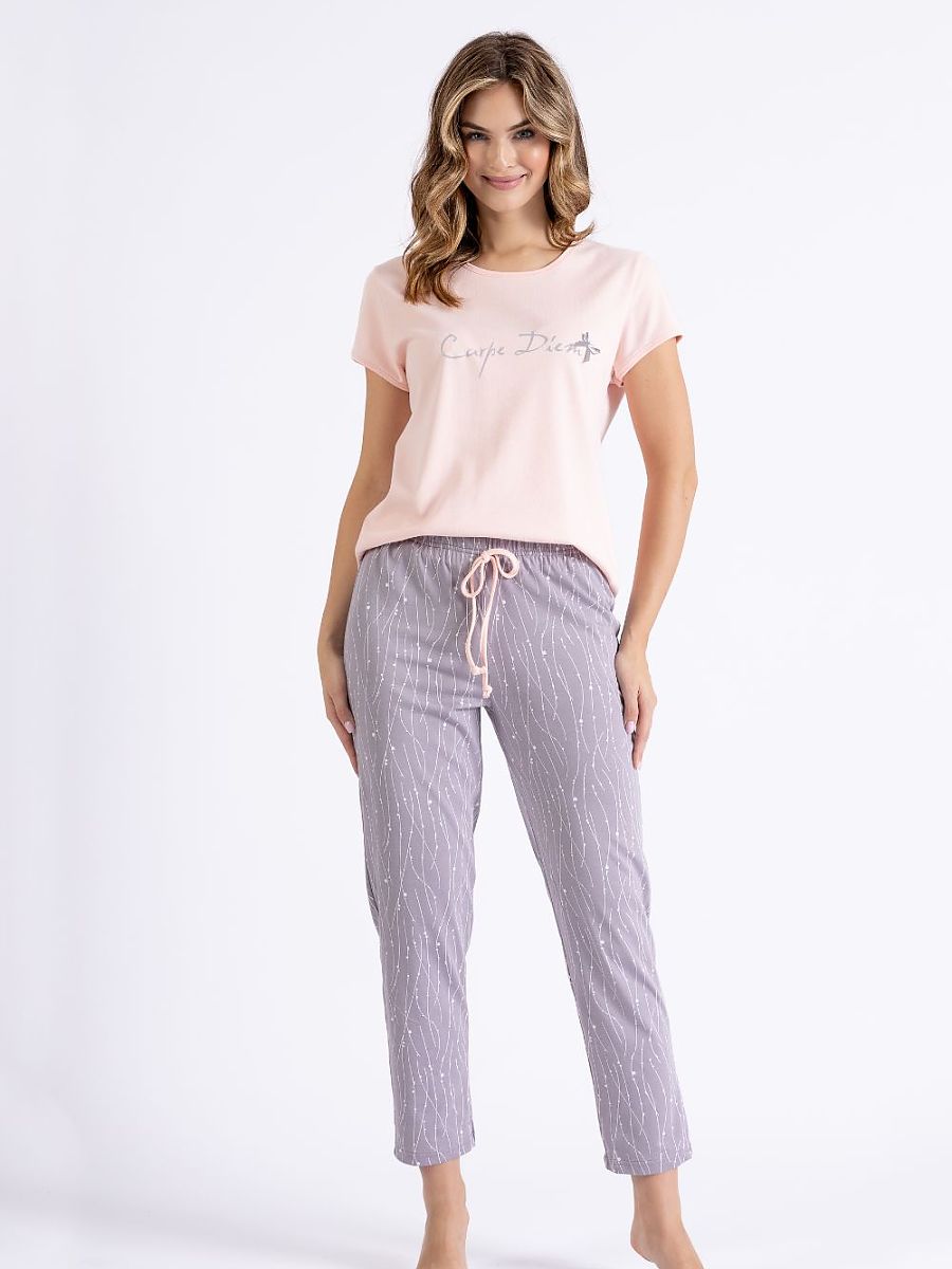 Women’s pajamas created with comfort and style in mind. The short-sleeved blouse, adorned with a print, has a round and loose neckline, a comfortable cut that will be perfect for every night. Made of soft and breathable fabric, it provides comfort during sleep. 7/8 length pants, with a print and regular cut, are equipped with drawstrings at the waist, which allow for a perfect fit to the silhouette. The whole combines functionality and subtle style, perfect for every night.