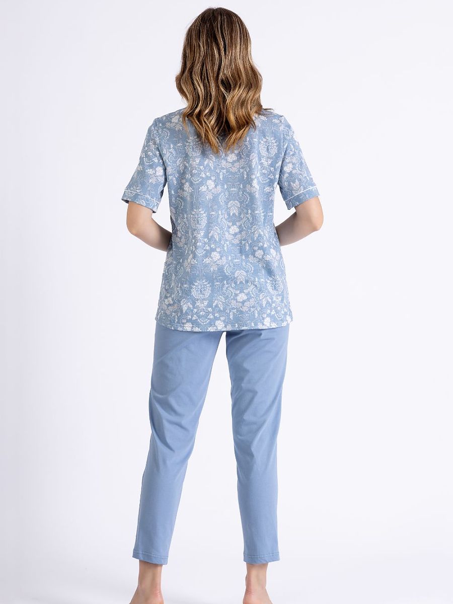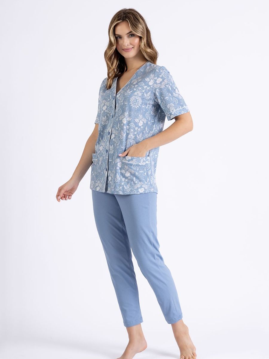 Elegant women’s pajamas that combine style with comfort. The short-sleeved shirt is decorated with subtle prints and finished with elegant piping, which gives it a unique character. The loose, comfortable cut provides freedom of movement, and the soft and breathable fabric guarantees comfortable wear throughout the night. The shirt is buttoned and has practical pockets on the sides, making it the perfect combination of functionality and style. Smooth 7/8 length pants without pockets perfectly complement the set, creating a harmonious sleepwear outfit.