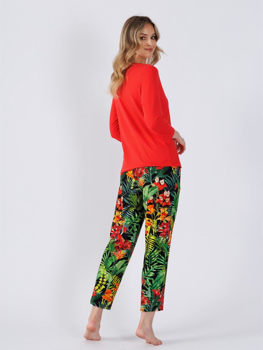 Women’s pajamas combining comfort and style. The blouse with 7/8 sleeves, with a delicate round neckline, is made of smooth, pleasant to the touch fabric. Loose, comfortable cut provides comfort and freedom of movement, and additional pockets add functionality and charm. The 7/8 length pants, decorated with a fashionable print, are finished with an elastic band at the waist, which ensures a perfect fit. The whole is a combination of elegance and comfort, perfect for a relaxing evening or a peaceful day at home.