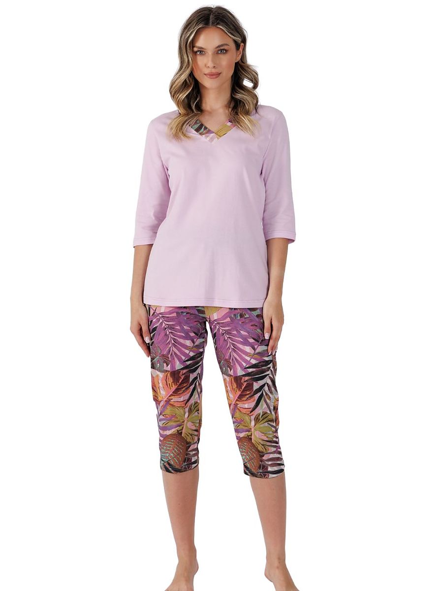 Women’s pajamas combining elegance with comfort, perfect for relaxing evenings. The solid-colored blouse with 3/4 sleeve features a V-neckline finished with a subtle trim, adding elegance and style. The loose, comfortable fit of the blouse is made of soft and breathable fabric, ensuring comfort throughout the night. 3/4 length pants with a print, finished with an elastic waistband, guarantee a perfect fit and freedom of movement. An ideal combination for people who value both aesthetics and comfort.