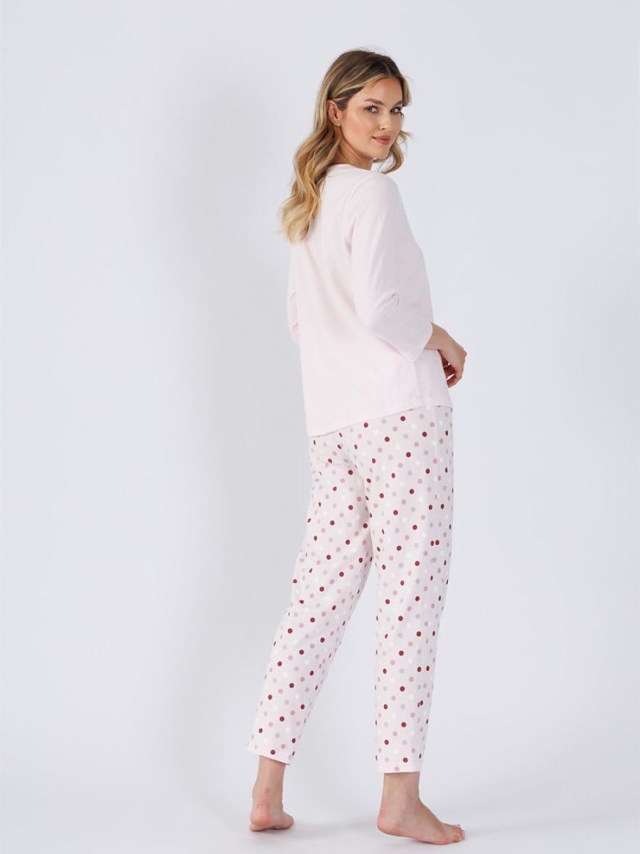 Enjoy comfort and elegance with our unique women’s pajamas. The 3/4 sleeve blouse has a rounded neckline that adds subtle charm. The loose fit provides comfort throughout the night, and the print material in subdued colors adds elegance. Made from soft and breathable fabric, the blouse is comfortable to the touch and perfect for relaxation. The 7/8 pants are regular fit and have no pockets, making them both practical and stylish. The waistband has an elastic band and a decorative bow that adds a romantic touch to the whole. The set comes in an elegant bag, making it the perfect gift.