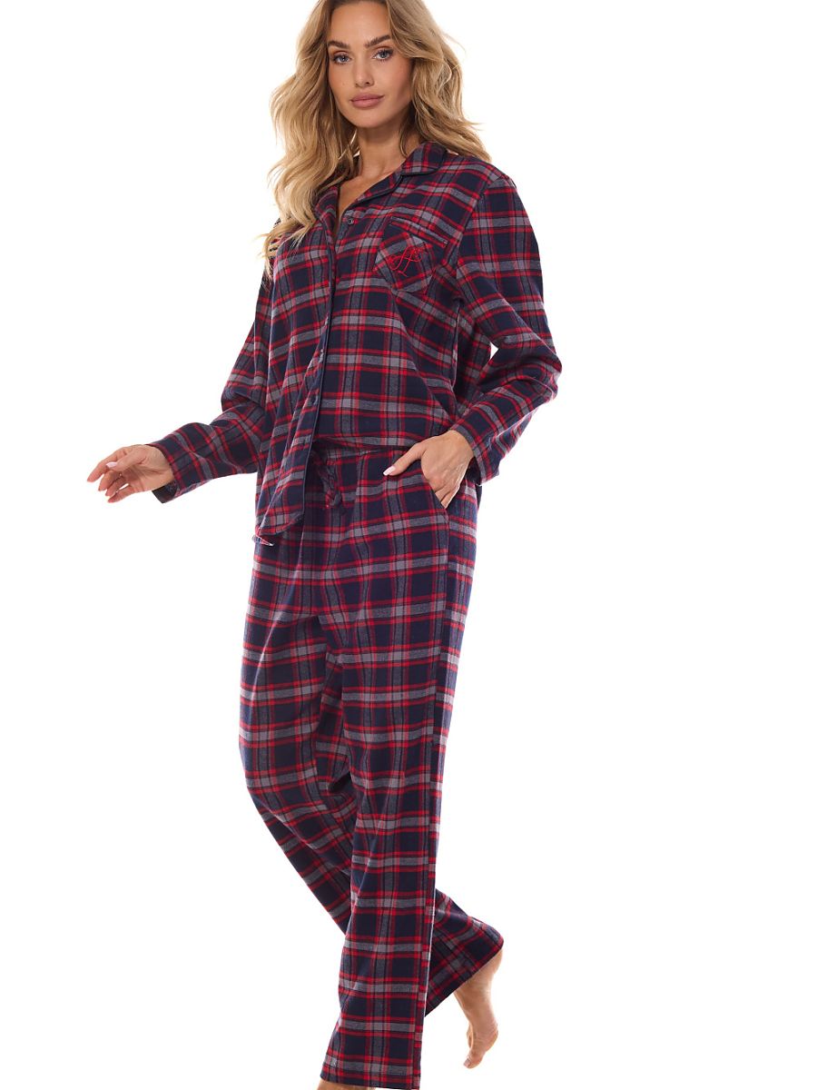 This unique women’s pajama combines elegant design with the highest comfort of use. The long-sleeved shirt, buttoned up, stands out with stylish finishing in the form of delicate piping and embroidery at chest height. An additional pocket on the chest emphasizes its practicality and unique character. Made of material with a trendy check print, the pajama looks stylish and versatile. Pants with long legs, pockets, and an elastic waistband provide comfort and freedom of movement. The loose, comfortable cut of the whole makes it perfect not only as sleepwear but also as an elegant homewear element. The shirt sleeves and pant legs are finished with cuffs, adding a touch of elegance. Packed in an elegant bag, it makes a perfect gift for a loved one. Designed and sewn in Poland, the pajama guarantees high quality and meticulous workmanship, meeting the expectations of even the most demanding women. An ideal choice for every season!