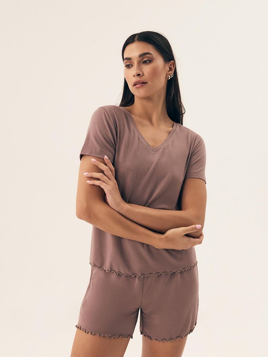 Stylish women’s pajamas, made of delicate viscose, providing comfortable sleep throughout the night. The short-sleeved top with a V-neck, adorned with subtle lace at the bottom, perfectly complements the short shorts, which have a wide elastic waistband for even greater comfort. The smooth fabric makes the pajamas pleasant to the touch, ideal for warm nights. The product is packed in a practical plastic bag, also perfect for a gift.