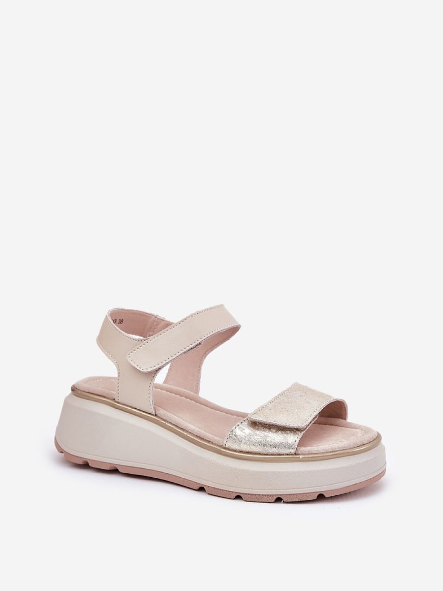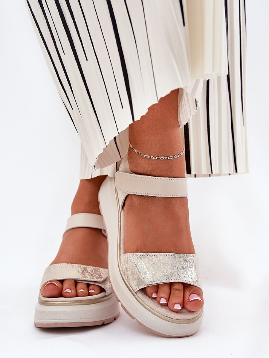 Women’s leather sandals, set on a platform and wedge heel, which combine comfort with an elegant look. Fastened with two Velcro straps, ensuring easy adjustment to the foot. The leather insole guarantees comfort all day long, providing proper cushioning. Perfect for summer days, these sandals will be an ideal choice for dresses, skirts, or trousers.