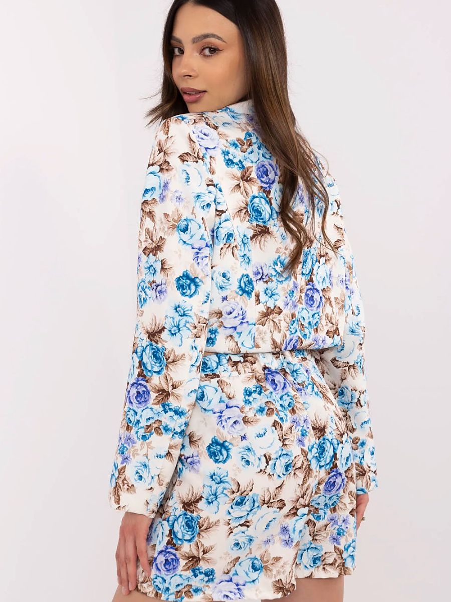 A unique women’s set combining elegance with girlish charm, a short blazer and shorts-skirt in a trendy floral pattern is the perfect choice for everyday wear, work, official meetings, or parties. The cropped blazer with lapels and double-breasted fastening beautifully accentuates the waist, while the lining ensures comfort. A decorative, detachable brooch adds sophistication and allows for subtle adjustment of the style to the occasion. The high-waisted shorts-skirt combines the look of a classic skirt with the comfort of shorts. The sewn-in elastic at the back of the waistband provides a perfect fit and comfort throughout the day, even during more intense activities. The absence of pockets maintains a smooth line of the silhouette. Made from a high-quality blend of polyester and elastane, the set presents itself lightly and femininely, while also being comfortable and practical.