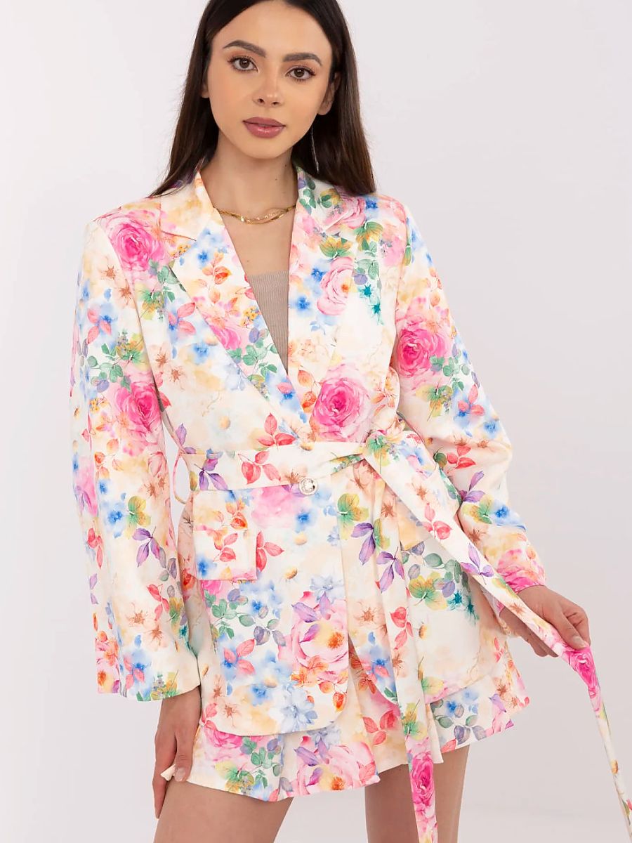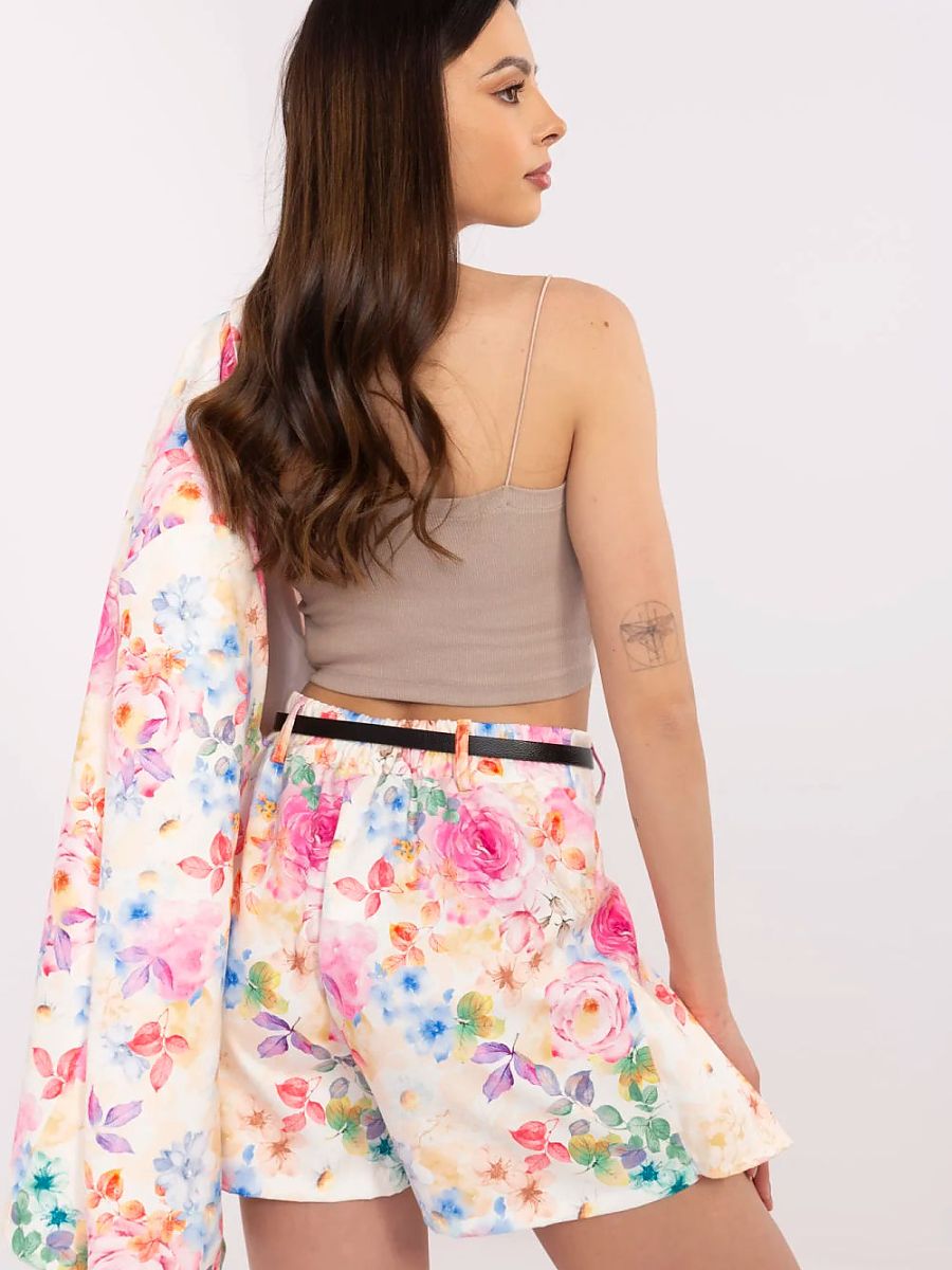 The feminine and classy women’s set consisting of a blazer and shorts is an ideal proposition for any occasion from everyday outings, through work, to elegant receptions. The floral pattern gives the set a subtle freshness, while the elegant cut highlights the silhouette. The blazer features long sleeves, lapels, and a button closure, enriched with sewn-in shoulder pads that beautifully shape the line of the shoulders. The included belt allows for a tailored fit and adds an individual character to the styling. The high-waisted shorts combine the feminine look of a skirt with the comfort of shorts. The pleated front and elegant waistband create a striking accent and elongate the silhouette. The absence of pockets gives the whole outfit a lightness and elegant finish. Made from a blend of polyester and elastane, the set ensures comfort while wearing and a perfect look throughout the day.