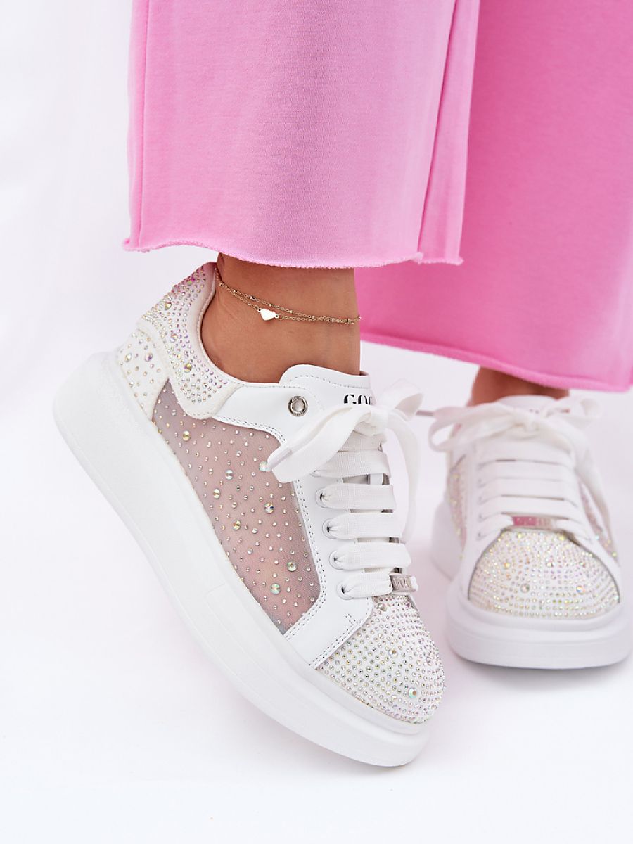 Women’s sports shoes from the GOE brand. Made of a combination of natural leather and textile material. Adorned with numerous crystals that give them a unique shine, distinguishing them from other models. Set on a platform, they provide stability and comfort, and rounded toes guarantee comfort throughout the day. These stylish shoes will be a great choice that will add character to any everyday outfit.