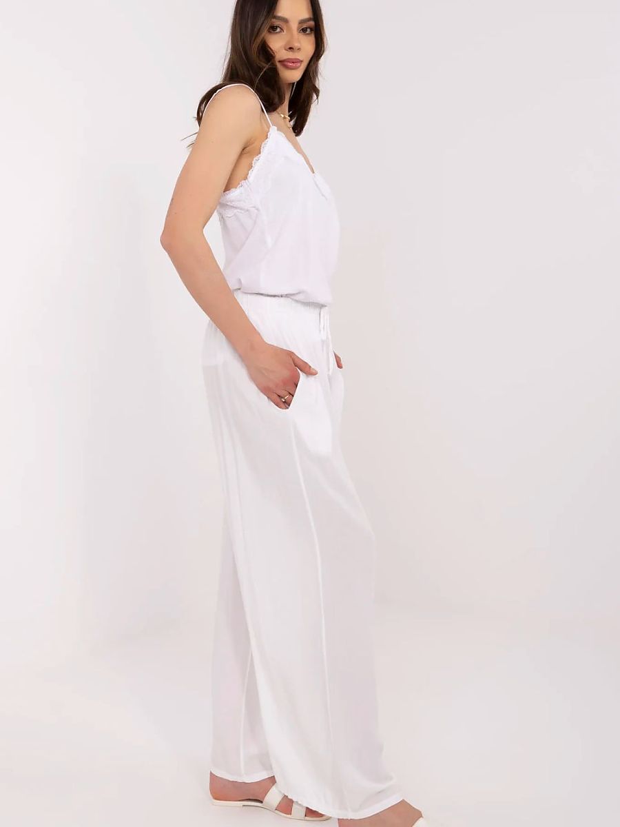 Lightweight, feminine, and incredibly comfortable, women’s palazzo trousers are the perfect choice for everyday casual styling. Made from breathable viscose, they are ideal for warmer days, providing comfort and freedom of movement. The high-waisted model with a tie at the waist beautifully accentuates the waist, while the wide legs add lightness and a modern character to the outfit. The absence of closures and pockets highlights the minimalist, smooth design, which can easily be paired with both a fitted top and a loose shirt. It is a must-have in every woman’s wardrobe who values comfort in an elegant style.