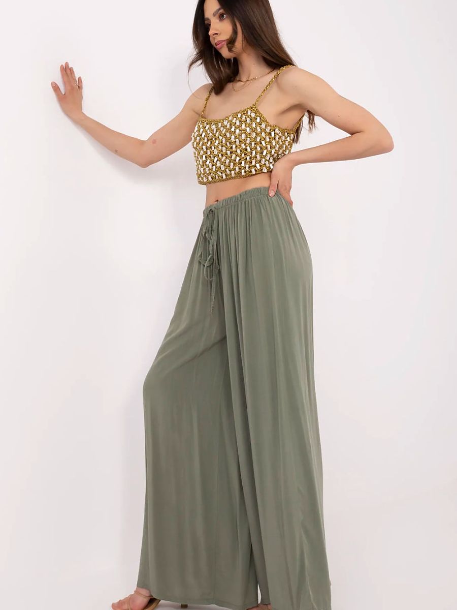 Lightweight, feminine, and incredibly comfortable, women’s palazzo trousers are the perfect choice for everyday, casual outfits. Made from breathable viscose, they are ideal for warmer days, providing comfort and freedom of movement. The high-waisted model with a belt beautifully accentuates the waist, while the wide legs add a sense of lightness and a modern character to the styling. The absence of fastenings and pockets emphasizes the minimalist, smooth design, which can be easily paired with a fitted top or a loose shirt. This is a must-have in every woman’s wardrobe who values comfort in an elegant form.