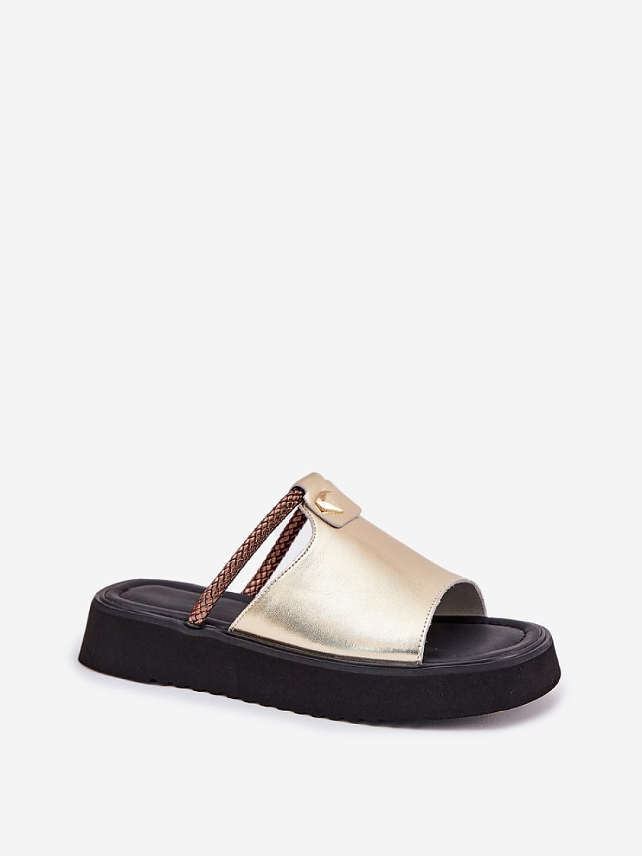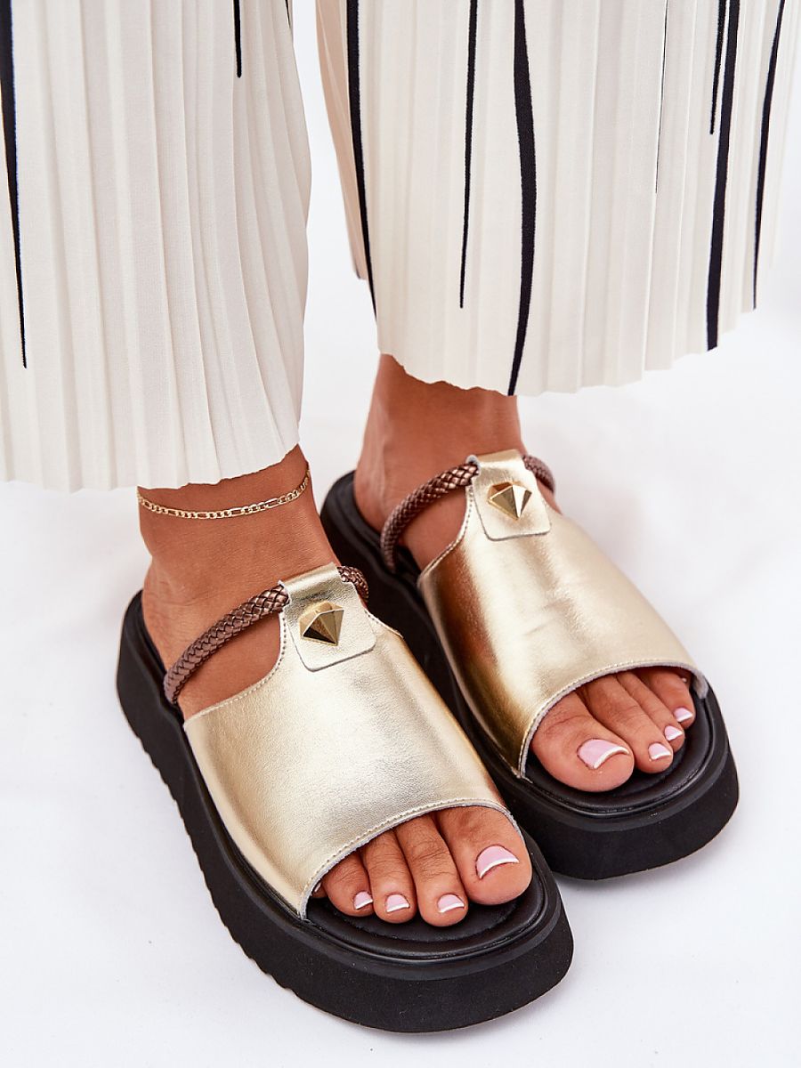 Elegant women’s leather sandals with a platform that combine comfort with subtle style. The front is adorned with a woven strap and a gold detail that gives it a unique character. The soft insole provides comfort all day long, ensuring proper cushioning. Perfect for warm days, these sandals will be an excellent choice for elegant stylizations, adding lightness and chic to every look.