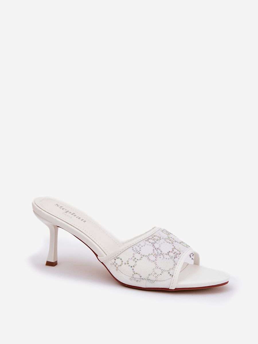 Women’s high-heeled mules. On the front, there is a subtle embellishment on the strap that adds unique charm to them. The soft insole made of eco-leather guarantees comfort throughout the day, making these mules an ideal choice for summer outings as well as more elegant occasions.