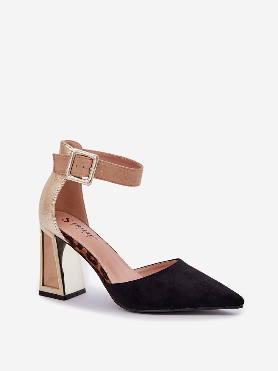 Colorful sandals made of eco suede are a bold and stylish proposition for women who like to stand out in the crowd. Set on a stiletto heel with a golden, mirrored element that adds a modern shine to them. Pointed toes give them an elegant character, while a covered heel and an adjustable buckle strap ensure comfort and stability. These sandals will be a perfect choice for evening outings, parties, or elegant meetings, combining unique design with functionality.