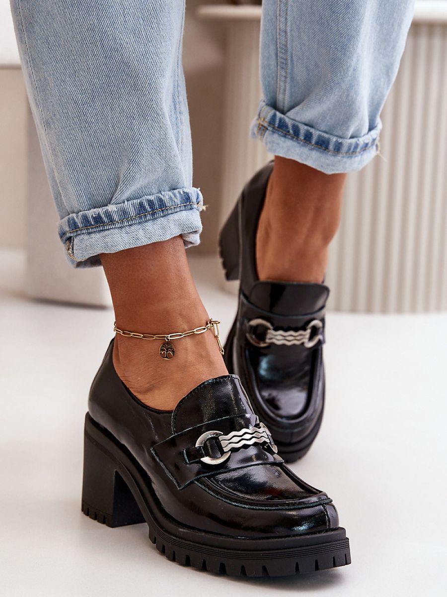 «Lacquered women’s leather shoes are the perfect choice for any occasion. Set on a column-shaped heel, they provide stability and comfortable wearing. There is a decoration on the front of the shoe. Additionally, this model has a reinforced heel counter. Perfect for both everyday and more formal stylizations.»