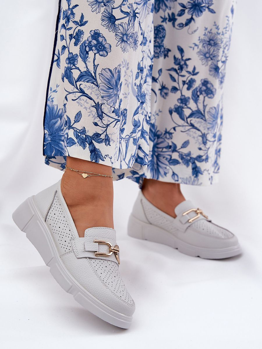 Women’s moccasins made of natural leather, set on a delicate wedge, combine elegance with comfort. Rounded toes provide comfort throughout the day, and a subtle gold ornament at the front adds a unique character to the shoes. The leather insole ensures proper cushioning, providing comfort with every step. These moccasins will be a perfect choice for everyday wear, perfectly matching both elegant and casual stylings.
