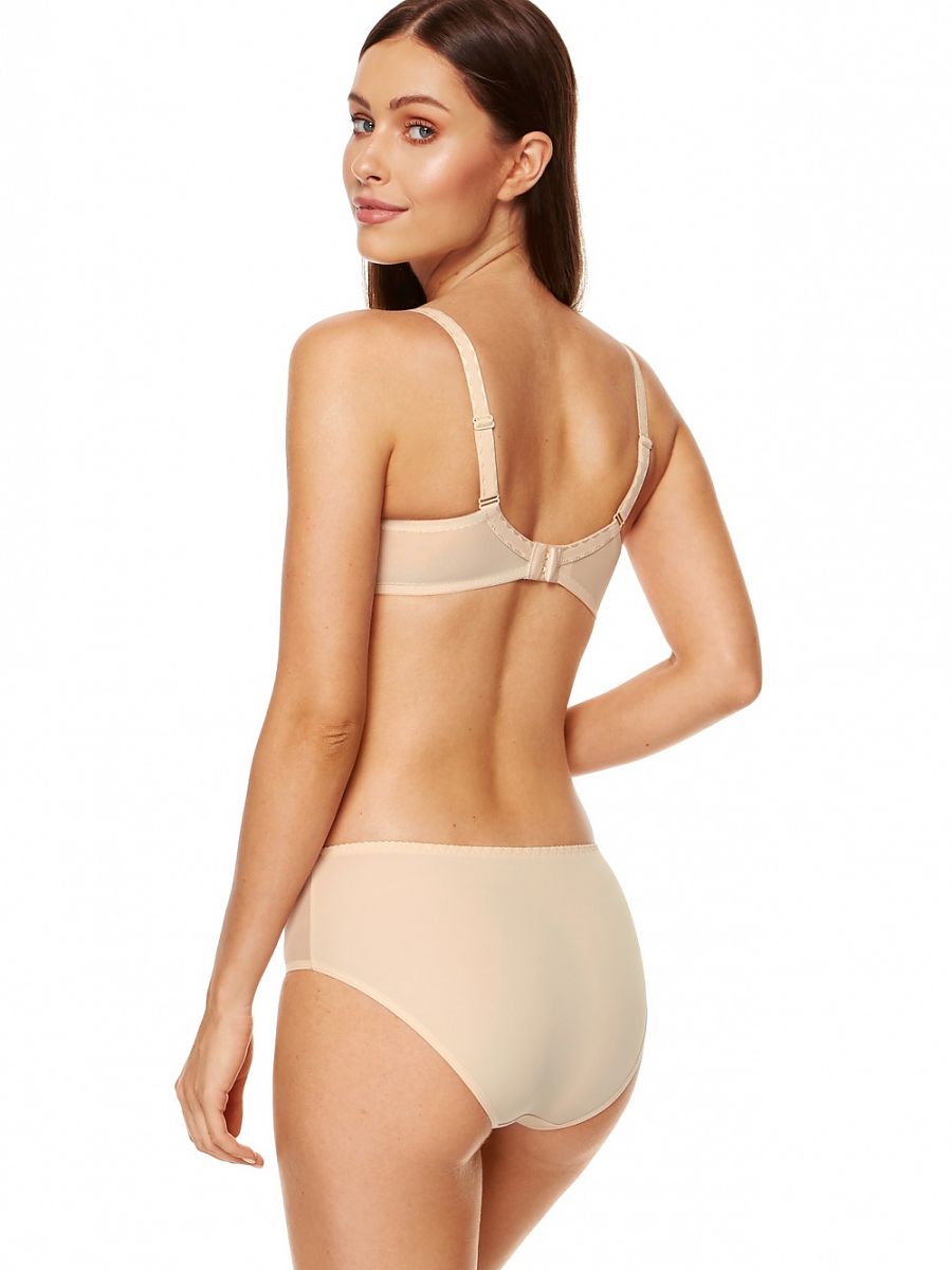 Thin corsetry foam bowls coated on the outside with smooth knit fabric. There is a small decorative bow between the bowls. The inner part of the cups is covered with OEKO-TEX-standard cotton, making them skin-friendly. The back of the bra is made of elastic tulle. Vertical side whalebones stabilize the bra’s circumference. The bra was designed and sewn in Poland.
