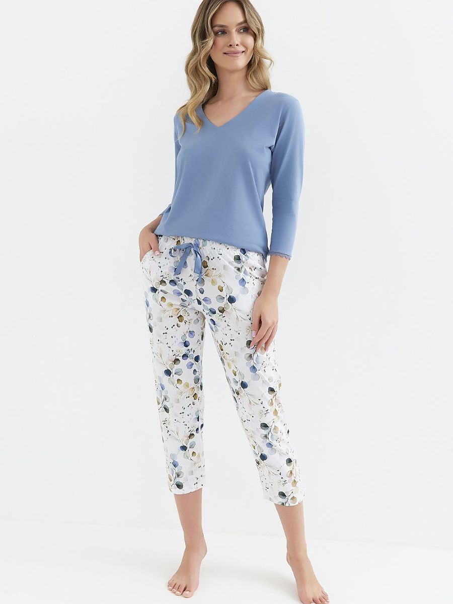 Women’s pajamas are a combination of elegance and comfort, perfect for relaxing after a long day. The blouse with a scoop neckline and a loose, comfortable cut provides comfort and freedom of movement. The 3/4 length sleeves are decorated with delicate lace, adding subtle charm and elegance. The 7/8-length pants with a fashionable print are equipped with practical pockets, which increase functionality and wearing comfort. The pajamas as a whole combine aesthetics with comfort, creating the perfect outfit for a quiet evening at home.