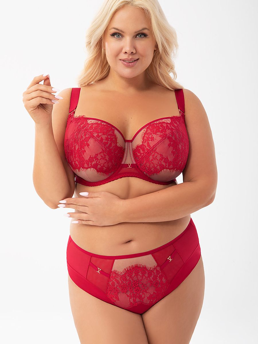 Soft bra designed for women with medium and large breasts. Provides a lifting effect and gathers the bust towards the center. 3-part cups made of stable lace with eyelashes on stable tulle. The upper edge of the cup is finished with smooth tape. A decorative element in rose gold color on the basque. The back made of transparent lycra ensures a very good fit and support. Side boning prevents the fabric from rolling up. Depending on the size, a two- or three-row hook with a three-stage circumference adjustment. Non-removable, adjustable straps in three widths, additionally reinforced with velvety tape in larger sizes. Metal elements in rose gold color (nickel-free).