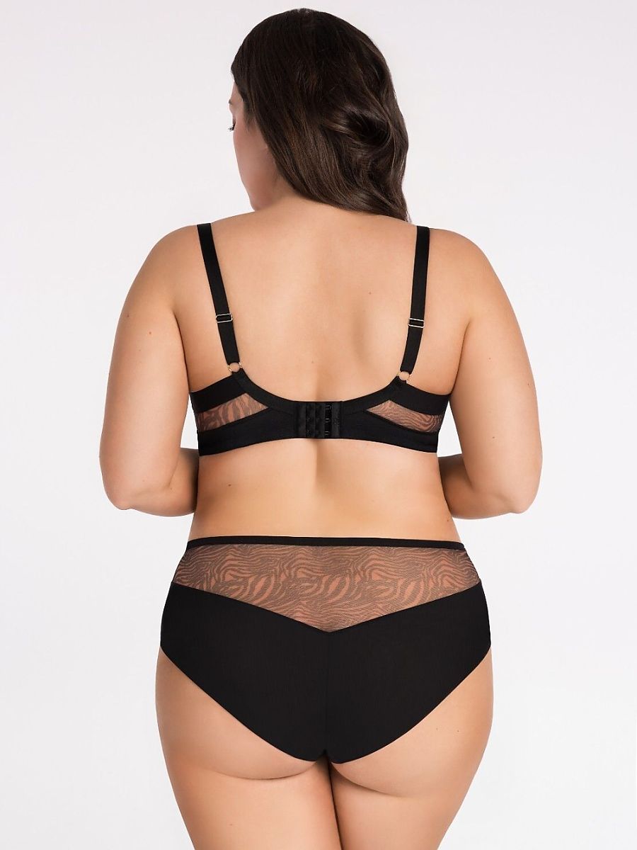 Soft bra designed for women with medium, large, and very large breasts. It provides a very strong lifting effect and gathers the breasts towards the center. The 3-part cups are made of stable tulle. The seams on the cups are covered with satin tape with an animal print. The upper edge of the cup transitions smoothly into the strap, causing better breast support. To increase comfort, the bra is finished with a wide, soft elastic band on the back. Side underwires prevent the material from rolling up. Depending on the size, a two or three-row hook and eye closure with three-step circumference adjustment. Non-detachable, adjustable straps in three widths. Metal elements in light gold color.