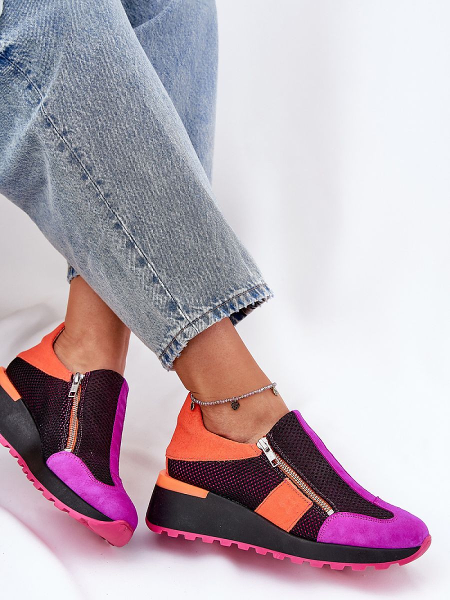 Women's sneakers from the Maciejka brand, made of a combination of natural suede and fabric, which blend comfort with modern design. Fastened with a double zipper, they ensure ease of putting on and adjustment. Set on a delicate wedge, they add lightness to the silhouette while providing comfort throughout the day. These sneakers are an ideal choice for those who value a fashionable yet functional style, perfect for everyday outfits.