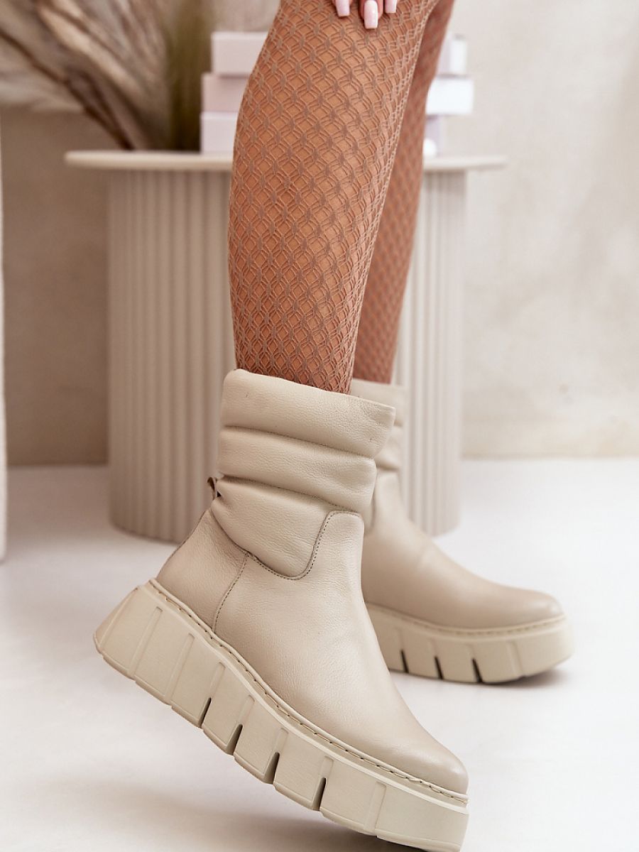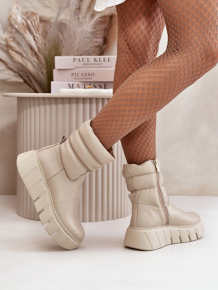 Women’s ankle boots made of high-quality natural leather are a perfect choice for autumn and winter. They have a practical zipper on the side of the shaft, which makes them easy to put on. Mounted on a platform with a delicate wedge heel, they combine modern style and comfort. The interior is lined with felt to provide warmth, and the rounded toes add classic charm. This model will certainly be a great addition to many autumn-winter stylizations.