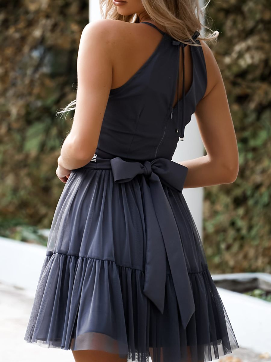 Elegant tulle dress with straps with adjustable tie. The dress fastens with a concealed zipper. Decorative belt for tying at the waist. Slightly flared bottom.