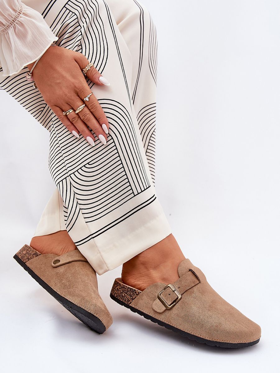 Women’s cork platform clogs. Made of eco suede. Covered toes provide greater protection, and the buckle allows for a perfect fit to the foot. The profiled insole ensures comfort throughout the day, providing proper support. These clogs will be an excellent choice for everyday wear, perfect for casual styling, providing comfort and a trendy look.