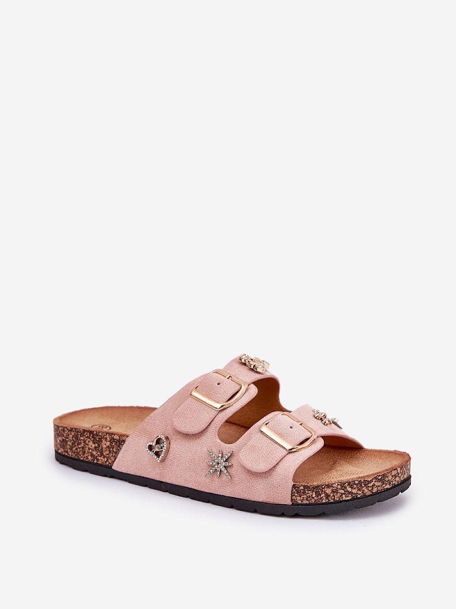 Women’s slippers made of eco suede, set on a lightweight cork sole. This model features stylish buckles and decorative pins that give it a unique character. Comfortable and fashionable, perfect for summer days!