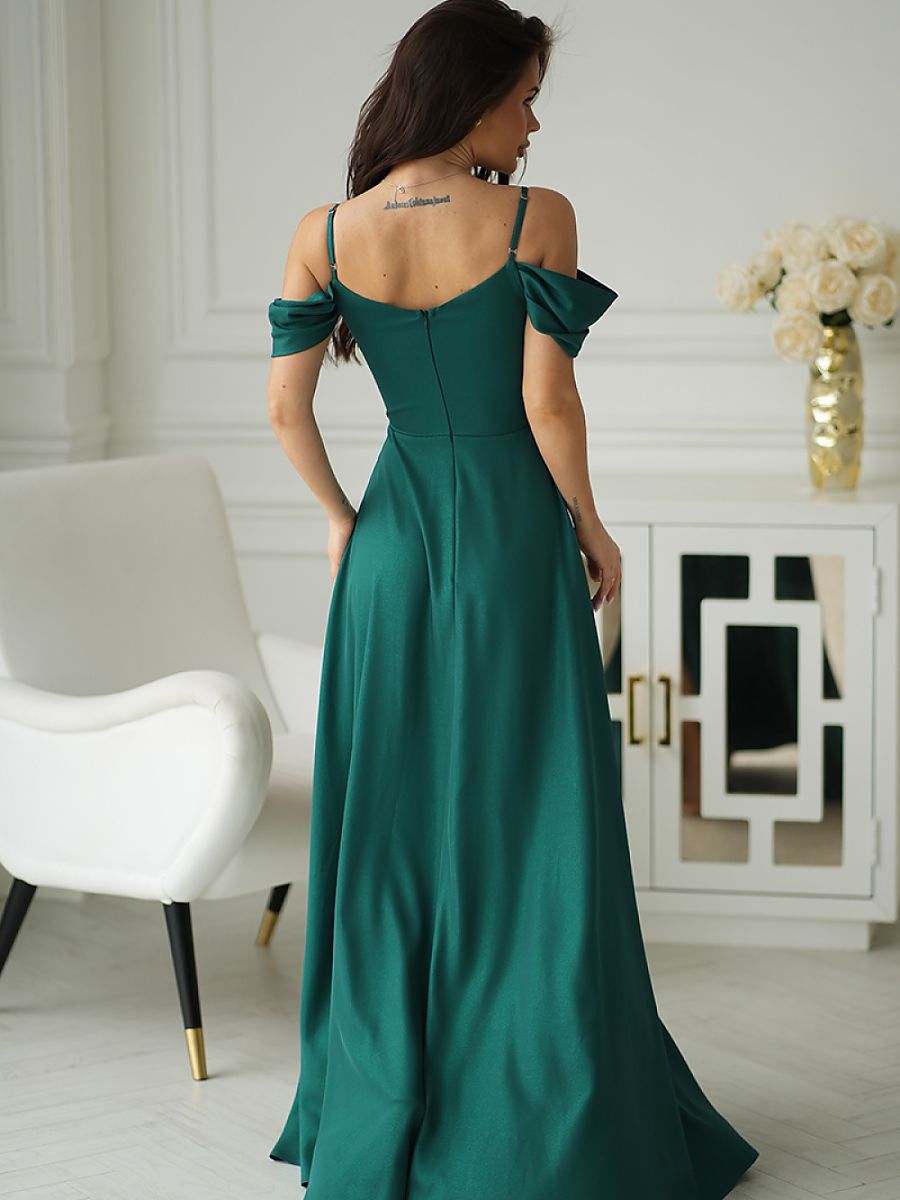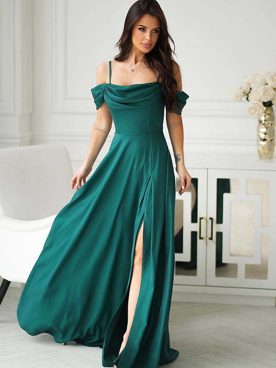 The fitted top emphasizes the waist, and the long, flowing skirt visually slims the silhouette. The eye-catching slit adds lightness and freedom of movement. Made of soft, shiny material that gently shimmers with every step. The dress fastens with a concealed zipper and has a lining. Perfect for special occasions, combining class and comfort.