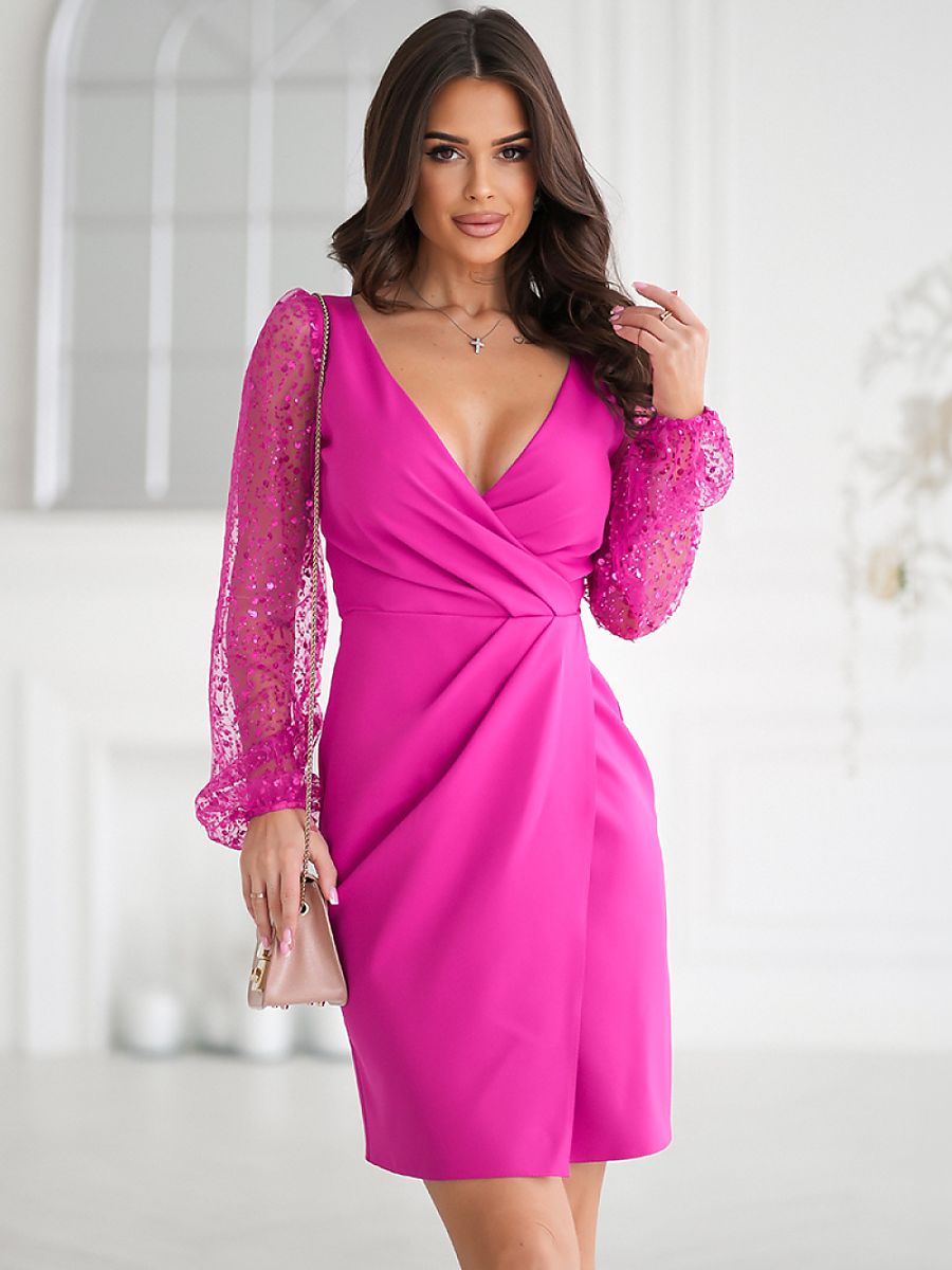 Sensational creation with two sequin sleeves. Delicate sweetheart neckline slightly exposes the bust. The bottom of the dress is pleated. The charm and elegance are added by sequin sleeves, which are the perfect addition to the outfit. Available in beautiful colors. The dress is fastened with a concealed zipper.