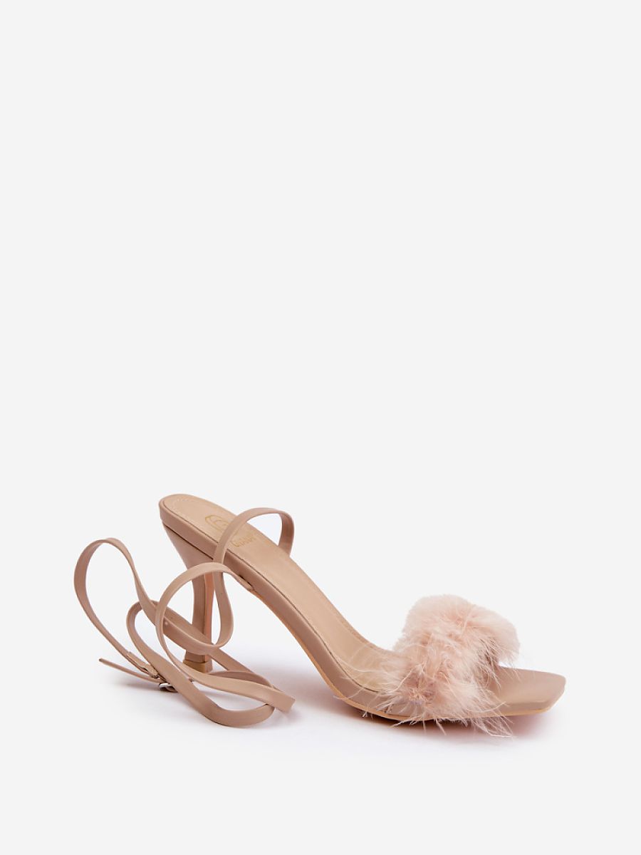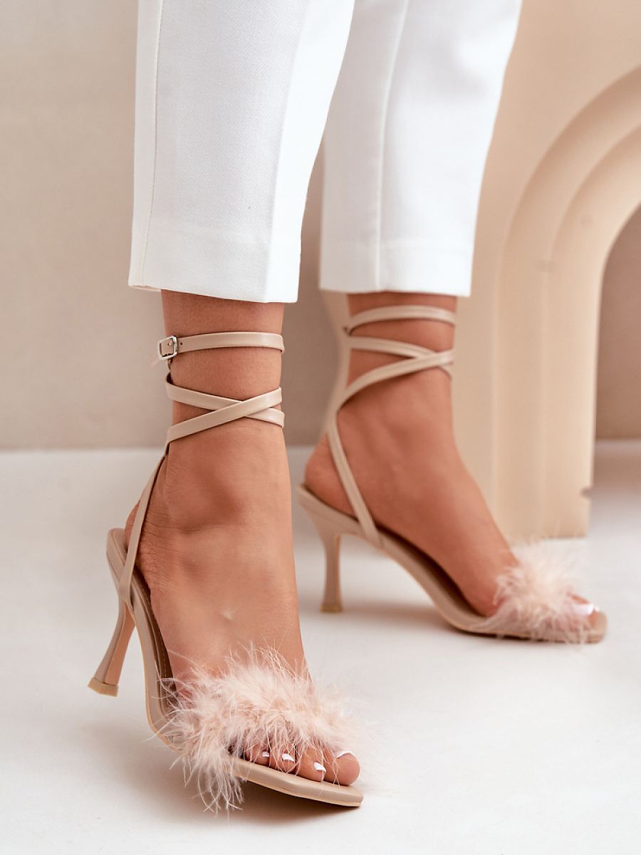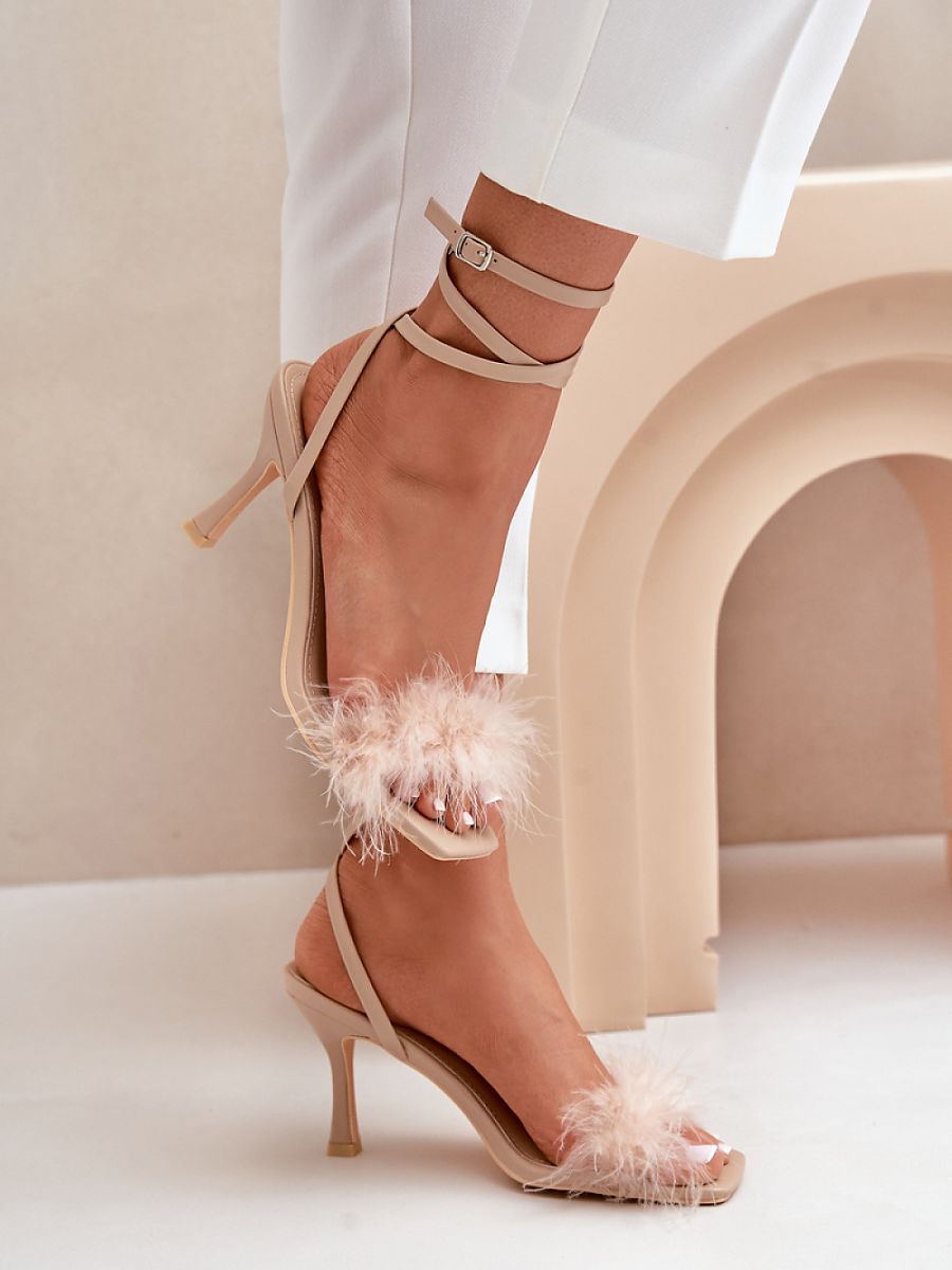 Stylowe damskie sandały wykonane z eko skóry, idealne na wyjątkowe okazje. Osadzone na eleganckiej szpilce, wyróżniają się ozdobą w formie delikatnych piór z przodu, które dodają lekkości i wyrafinowanego stylu. Zapinane na regulowany pasek ze sprzączką, zapewniają idealne dopasowanie do stopy. To oryginalny wybór, który świetnie uzupełni wieczorowe i koktajlowe stylizacje, przyciągając uwagę niepowtarzalnym designem.