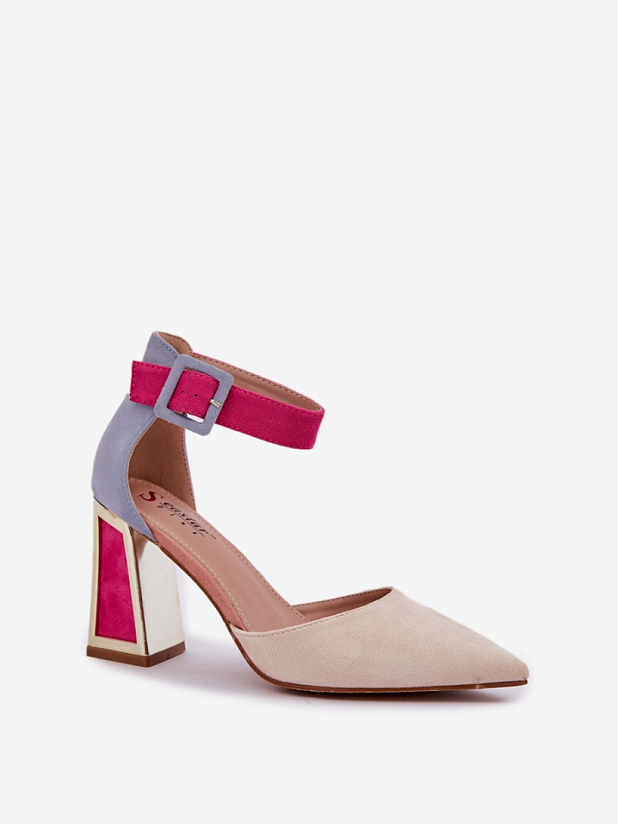 Colorful sandals made of eco suede are a bold and stylish proposition for women who like to stand out in the crowd. Set on a stiletto heel with a golden, mirrored element that adds a modern glow to them. Pointed toes give them an elegant character, while a covered heel and adjustable buckle strap provide comfort and stability. These sandals will be a perfect choice for evening outings, parties, or elegant meetings, combining exceptional design with functionality.