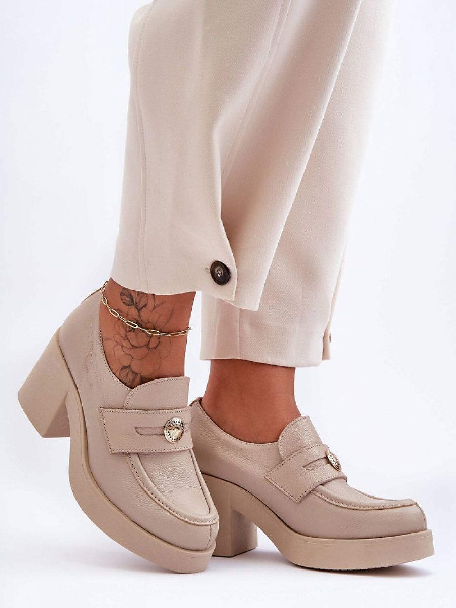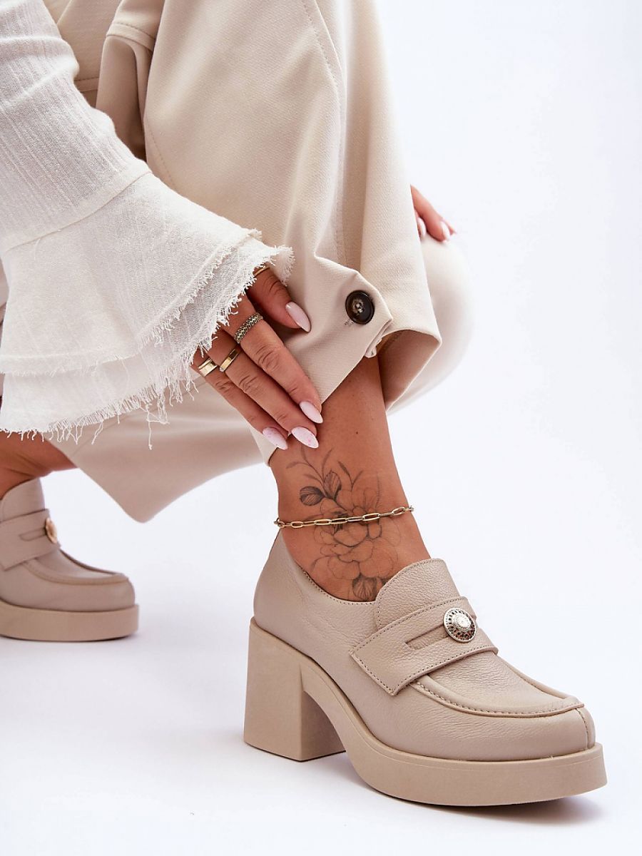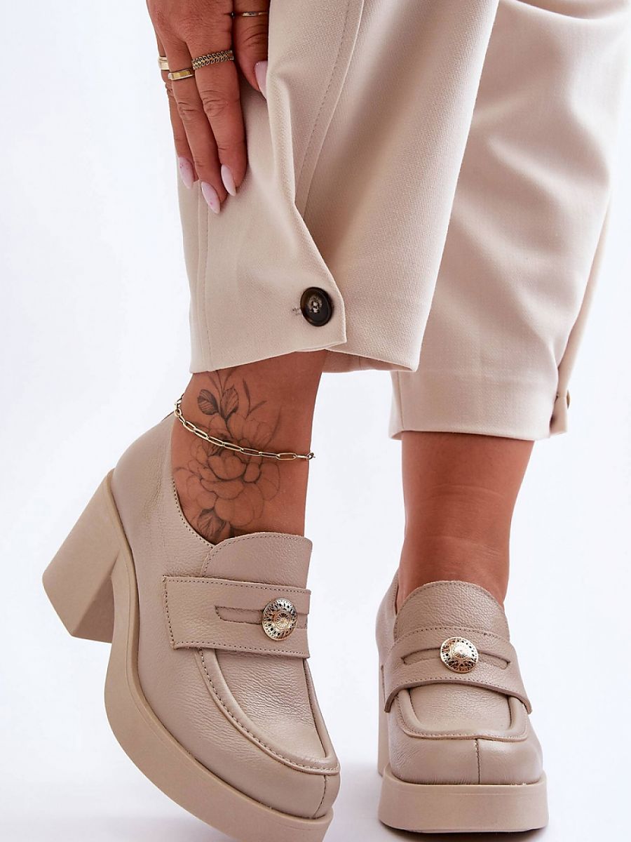 Women’s heeled half shoes with an upper made of natural leather. The interior is also covered with natural leather, thanks to which they are very comfortable to wear. The stylish heel in the form of a wide post will provide stability at every step. In addition, under the tongue there is a tightening elastic band, which will make the shoe perfectly fitted to the foot. This model has a padded heel counter and a small decoration on the strap.