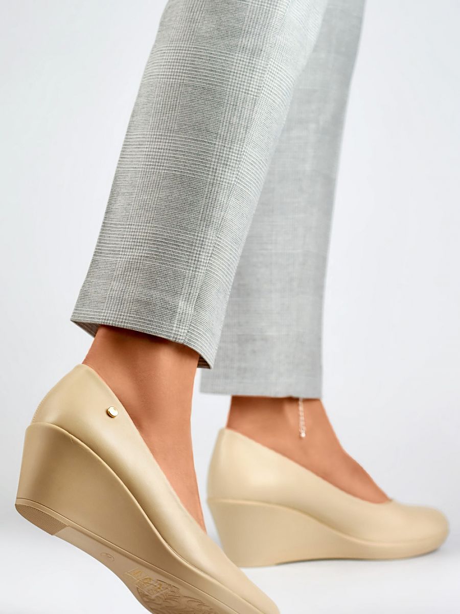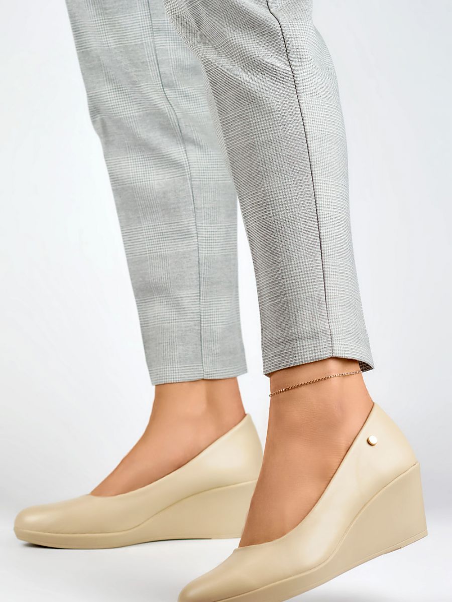 The pumps in a delicate beige shade are the quintessence of elegance and comfort, created especially for modern women who appreciate comfort and style. The upper made of high-quality eco-friendly leather gives the shoes a sophisticated look, while emphasizing their eco-friendliness. Designed with women in mind, these beige pumps are the perfect choice for spring and summer days, but will work just as well all year round, adding a chic touch to any outfit. The leather insole guarantees comfortable wear and adaptation to the shape of the foot. These pumps have a feminine 6-centimeter-high platform, which gives them a subtle lift while remaining elegant. Their slip-on design makes them easy to wear, making them ideal for a variety of occasions. The round toe adds a classic charm to the shoes and makes them versatile for pairing with a variety of outfits. These beige pumps are the perfect combination of style, comfort and a fashion-conscious approach.