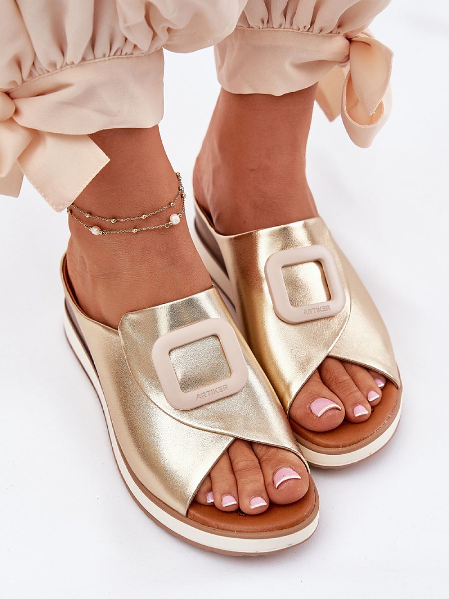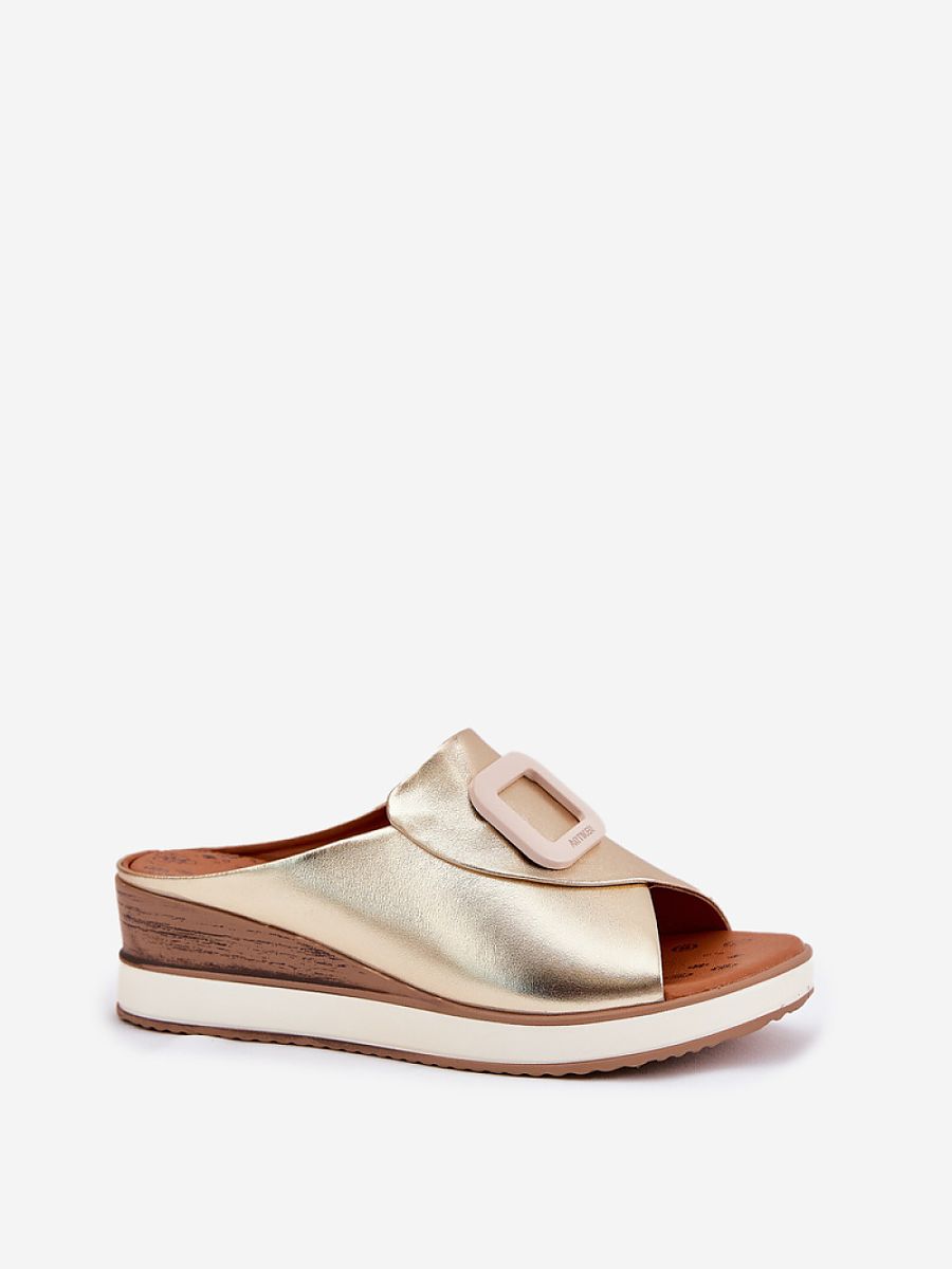 Women’s leather slippers are an elegant proposal for warmer days. Set on a wedge, they provide stability and comfort throughout the day. At the front of the shoes, there is a subtle decorative detail that gives them a unique character. The soft insole ensures comfort while wearing, and the stylish design makes the slippers a perfect addition to summer outfits.