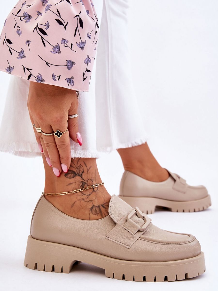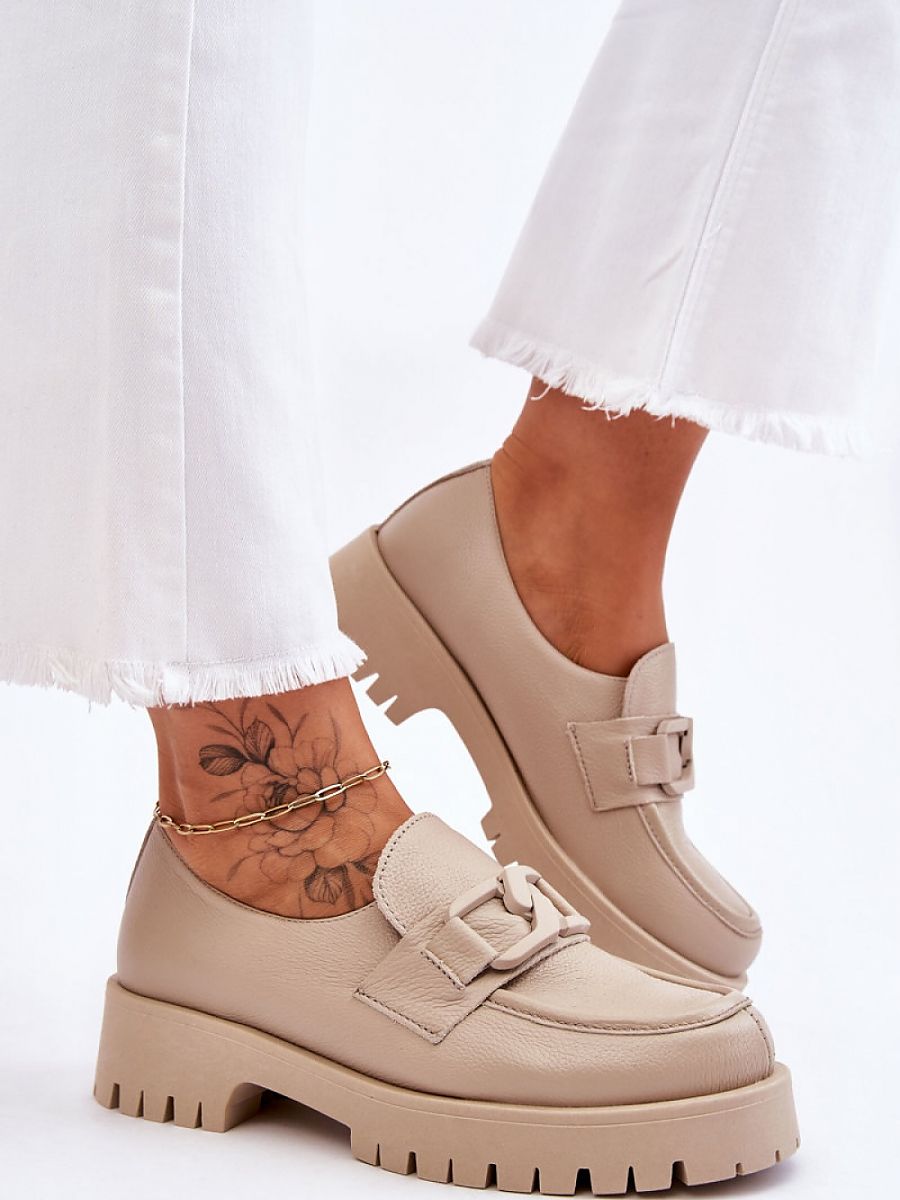 Slip-on half-shoes made of natural leather with a rounded nose. Set on a massive platform and a flat, stable heel. Model with high tread on the sole. On the top there is a decorative chain. Under the tongue there is an elastic drawstring, which will make the shoe more fitted to the foot. The half-shoes have a stiffened heel counter. Fashionable, comfortable, made with attention to detail, in a word: perfect! Soft, made of natural leather insole will take care of your comfort.