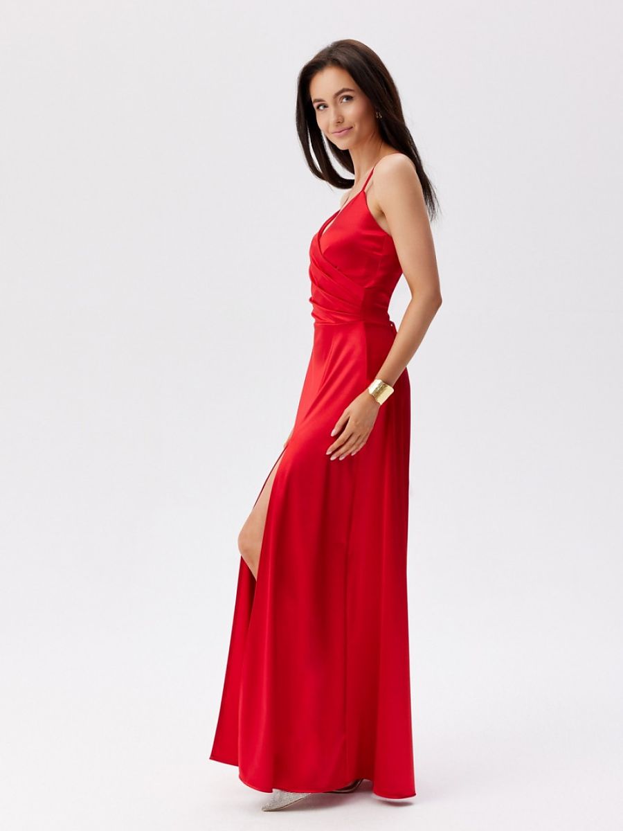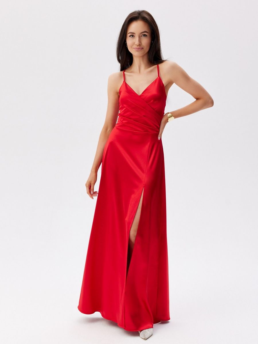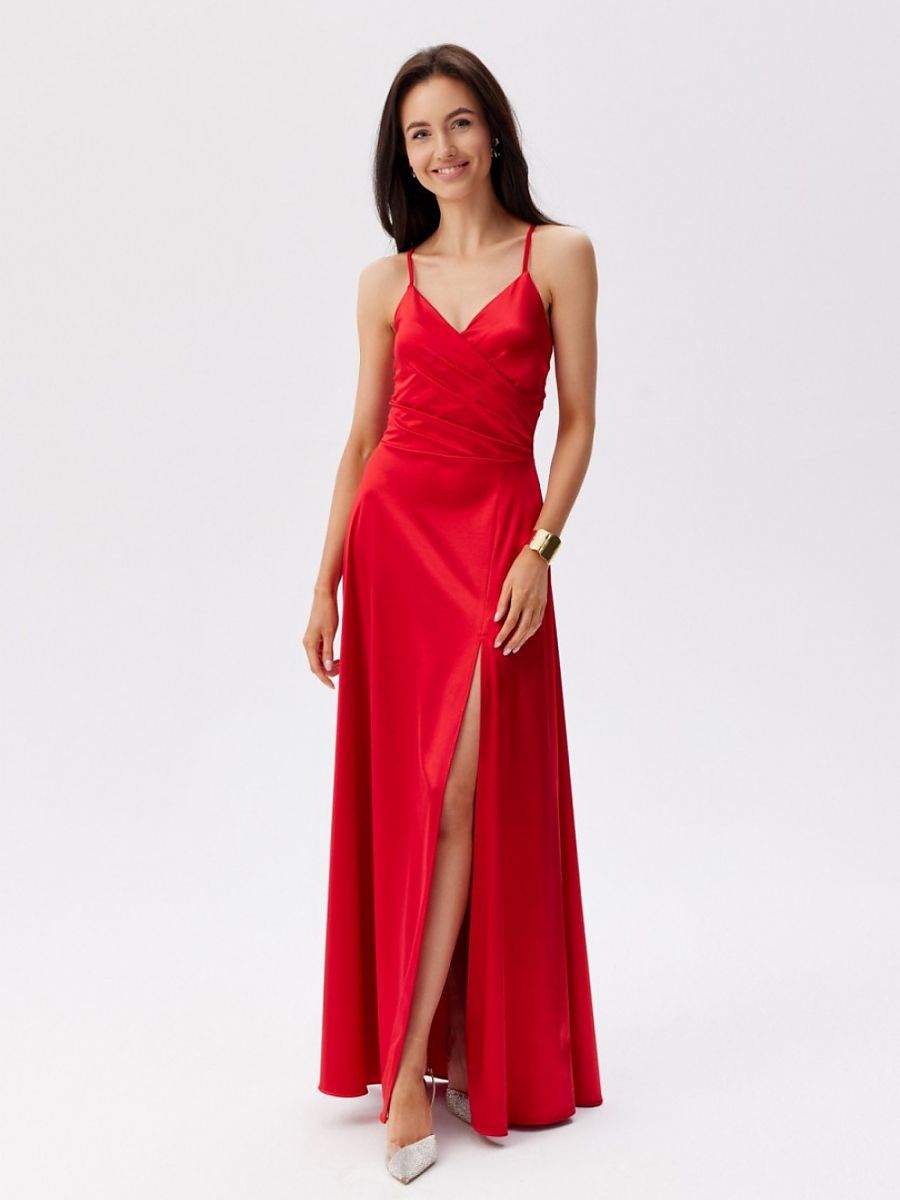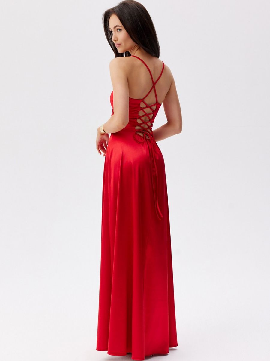 Maxi dress with thin straps. Wrap top, and a slightly flared bottom with a slit on the leg. It does not have a lining, it has decorative lacing on the back, which allows for a perfect fit to the silhouette.
