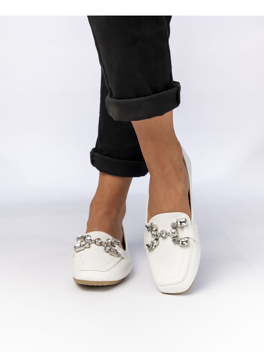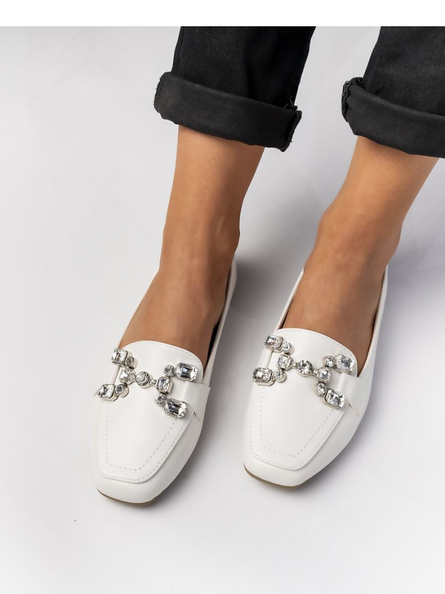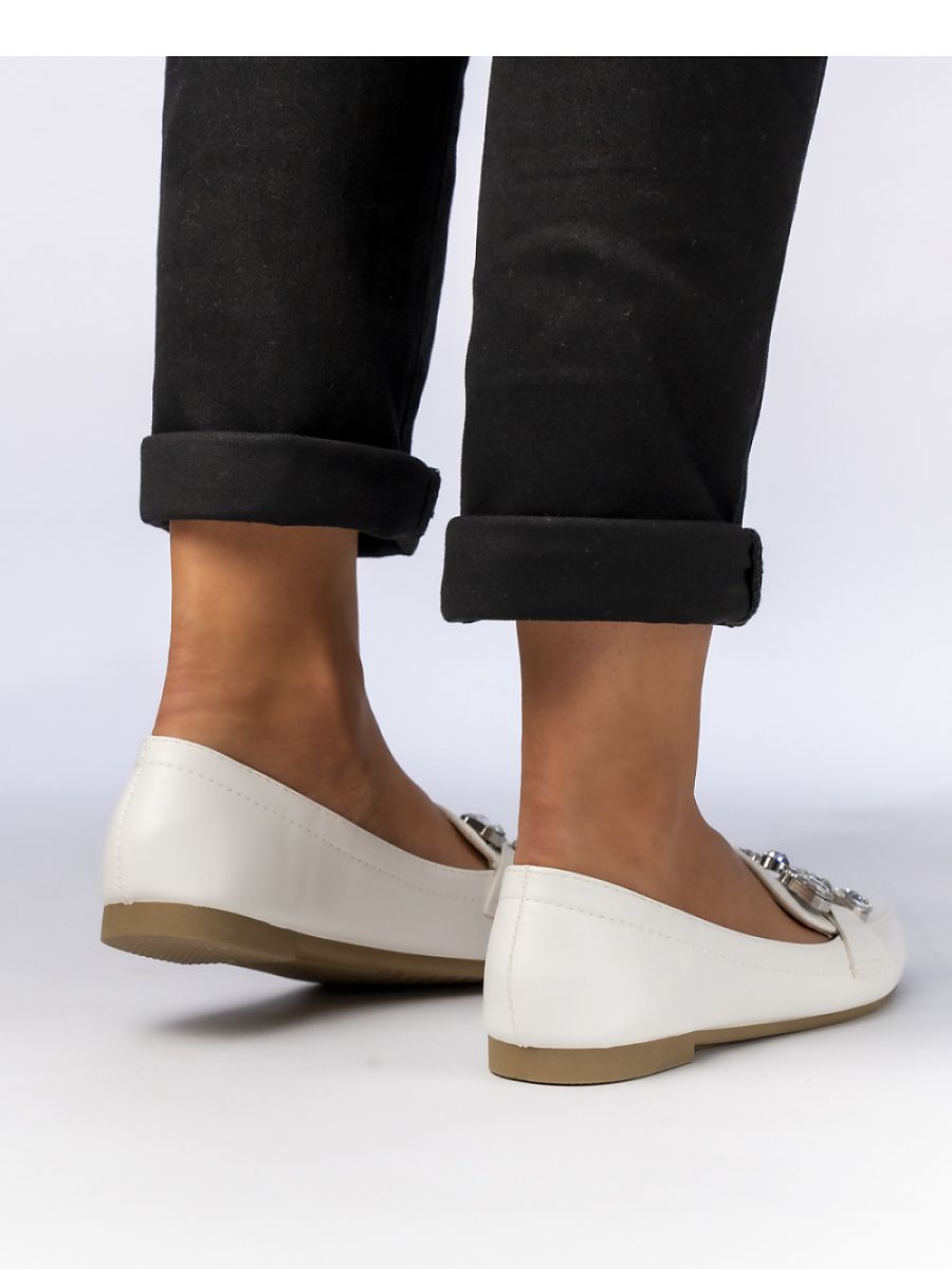 Women’s white ELEA moccasins are the quintessence of elegance and comfort. The classic style has been enriched with a striking metal decoration, giving them a unique character. Perfect for both everyday and more elegant stylizations. Thanks to the slip-on style, the shoes are extremely comfortable and practical.